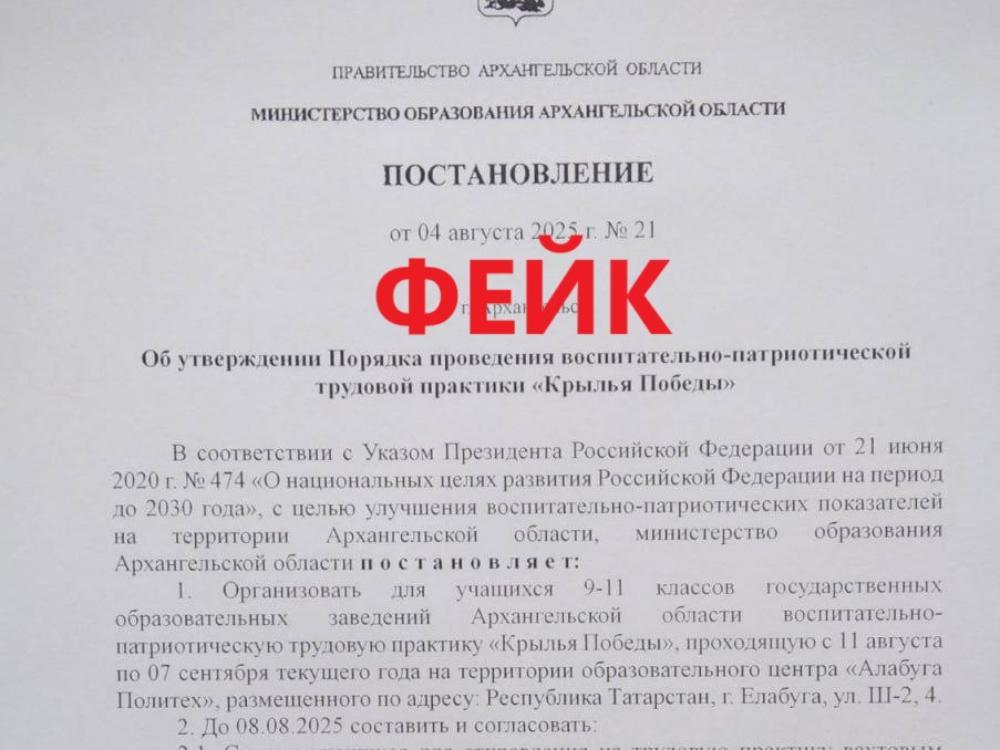 Сообщалось, что практика должна была пройти на территории образовательного центра «Алабуга Политех». Постановление якобы было подписано министром образования Архангельской области Русиновым.