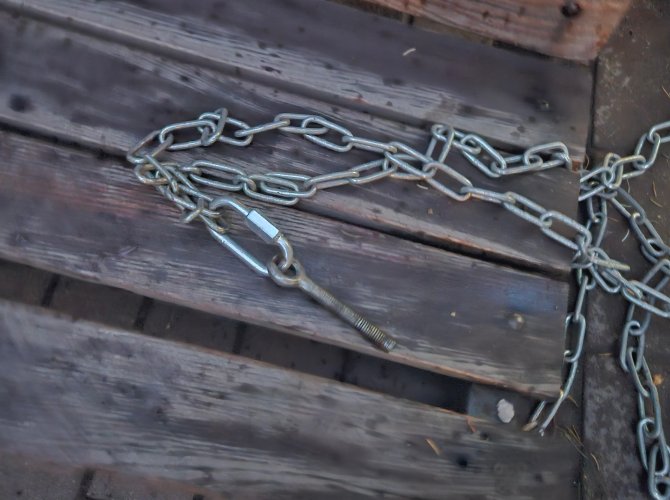 Очевидно, что крепления для цепей нужно выбрать надёжнее, как минимум вкручивать его не тупо снизу вверх, а сверху вниз и использовать деталь в виде буквы Т, где горизонтальная часть вкручивается (надёжно!) в вертикальную.