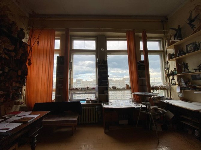 Мастерская Сергея Сюхина находится в том самом доме на Воскресенской. Да-да, если вы когда-то проходили мимо и удивлялись огромным панорамным окнам — знайте: это мастерские художников, построенные ещё в советские времена специально для творческих людей. Внутри — свет, простор и… удивительная аккуратность.