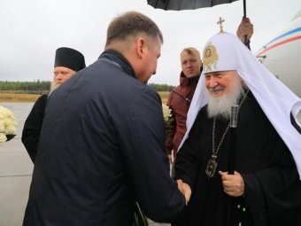 В аэропорту Соловки Святейшего Патриарха Московского и всея Руси Кирилла встретили губернатор Архангельской области Александр Цыбульский и наместник Свято-Преображенского Соловецкого ставропигиального мужского монастыря епископ Озерский Порфирий.