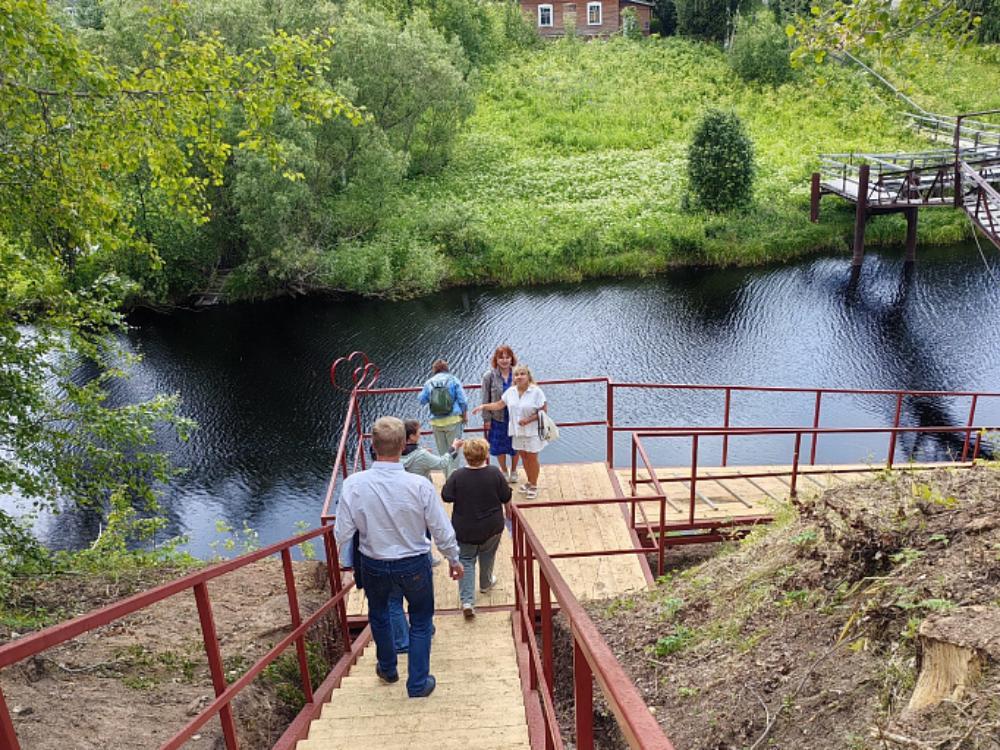 В рамках контракта специалисты подрядной организации разобрали прежнюю деревянную конструкцию подхода с правой стороны реки. Взамен смонтировали новый металлический спуск с перилами и деревянным настилом.