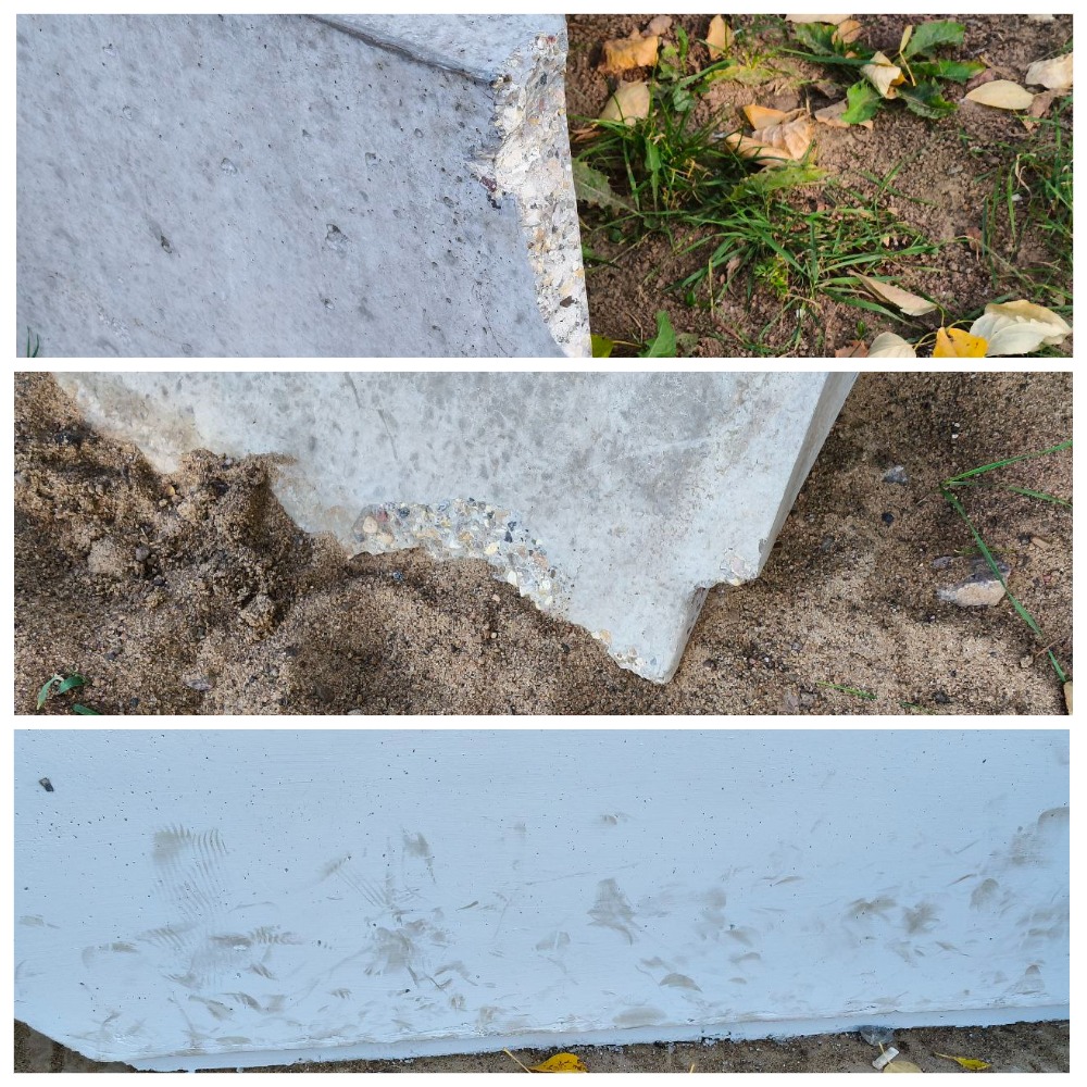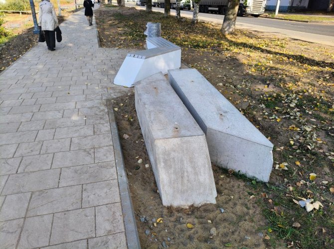 Далее людям предлагается отдыхать на бетонных тумбах с деревянным сиденьем. Часть из них уже установлены, а другие пока просто лежат в песке. Один блок уже не прошел испытание на антивандальность — углы раскрошились. Готовые лавки покрашены дешевой белой краской. Она пачкается обувью и уже выглядит не очень презентабельно. Выбор цвета — неудачное решение.