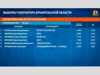 Голоса между кандидатами в губернаторы Архангельской области распределились следующим образом: