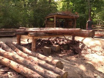 Небольшая пилорама развернута прямо в лесу недалеко от линии боевого соприкосновения. Здесь силами бойцов одной из частей делают столь необходимые доски и брус. Из данных материалов построен целый подземный город за считанные недели. В том числе из леса, который доставлен волонтерами из Архангельска. Сейчас здесь есть все необходимое, чтобы базировалось полнокровное подразделение.