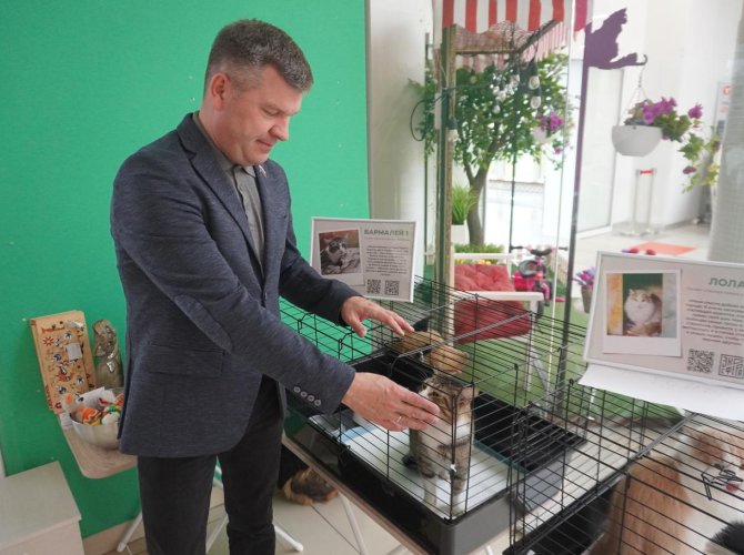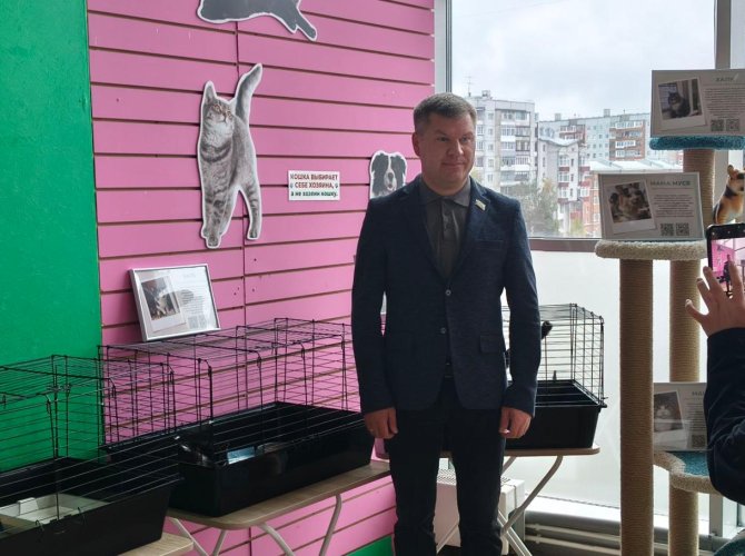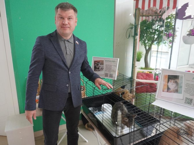 На открытии присутствовал и депутат Архоблсобрания Андрей Каракин, поддерживающий и выставку, и приют. Под бодрое мяуканье он рассказал про свою любовь к животным.