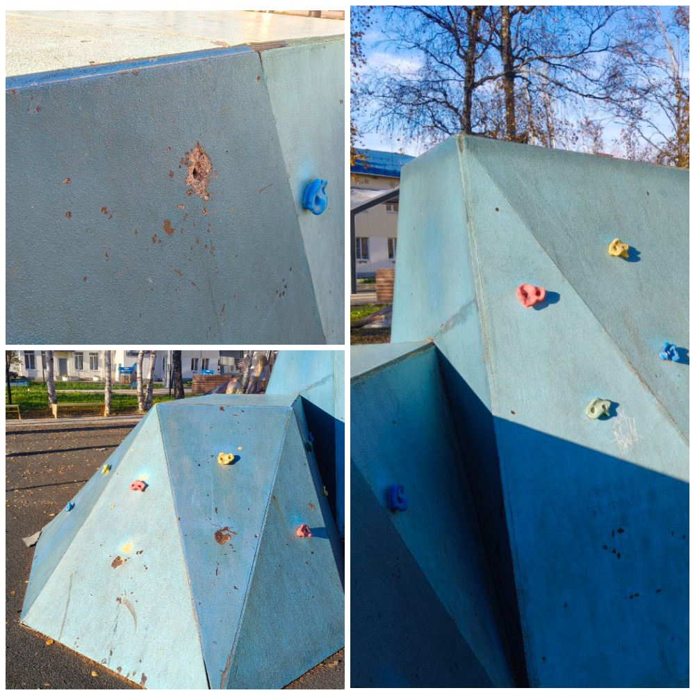 Так вот, в этой связи возникает вопрос: а остроугольная деревянная тумба высотой под 2 метра безопасна? Вырванные и сколотые зацепы на этом небольшом скалодроме говорят, что не очень. Понятно, что при желании можно убиться и упав с дивана, но тут как будто специально проверяют детей на прочность.