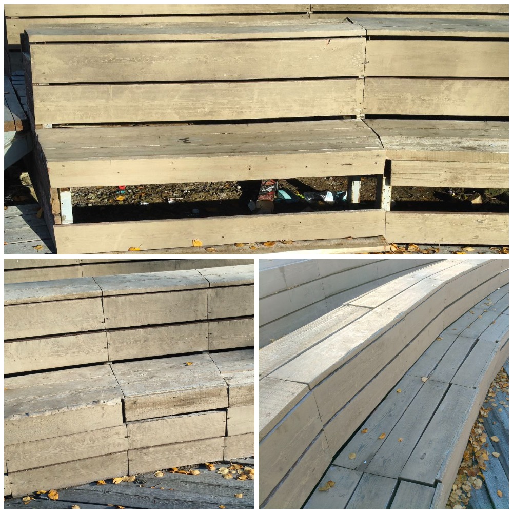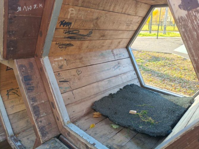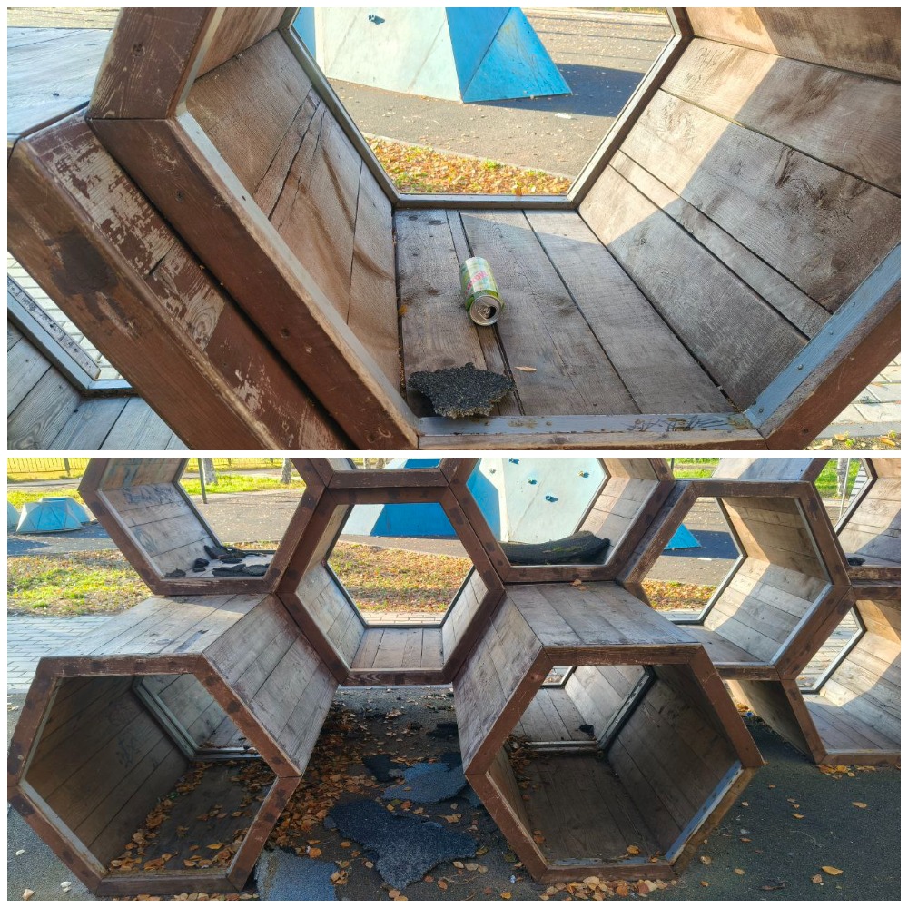 Зачем нужны деревянные соты посреди сквера, народ так и не понял, поэтому превратил их в галерею наскальной живописи и стеллаж для пустых банок и отвалившегося резинового покрытия детских площадок.