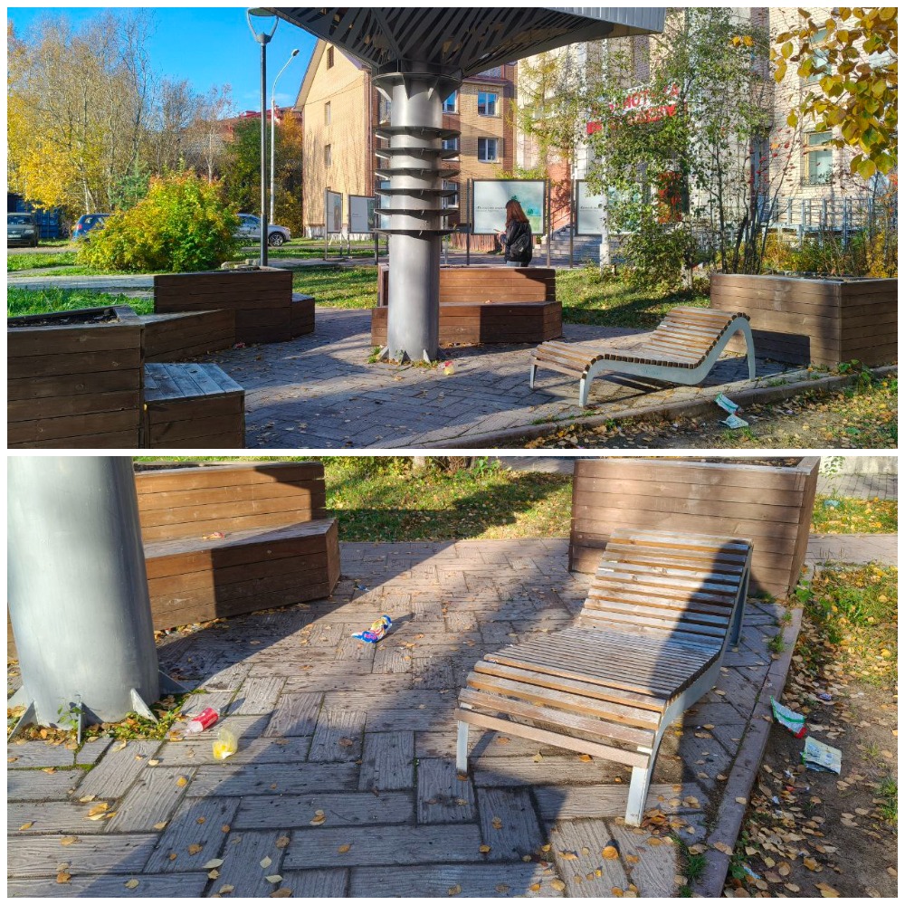 Зато «алкашиный грибок» выполняет свою функцию на 100%. Да, изначально там планировалась читальная зона, но общество решило иначе и в кругу из лавок и шезлонга для самых искушенных спившихся интеллигентов оказалось очень удобно устраивать вечерние консилиумы в свете фонарей. Количество мусора там соответствующее.