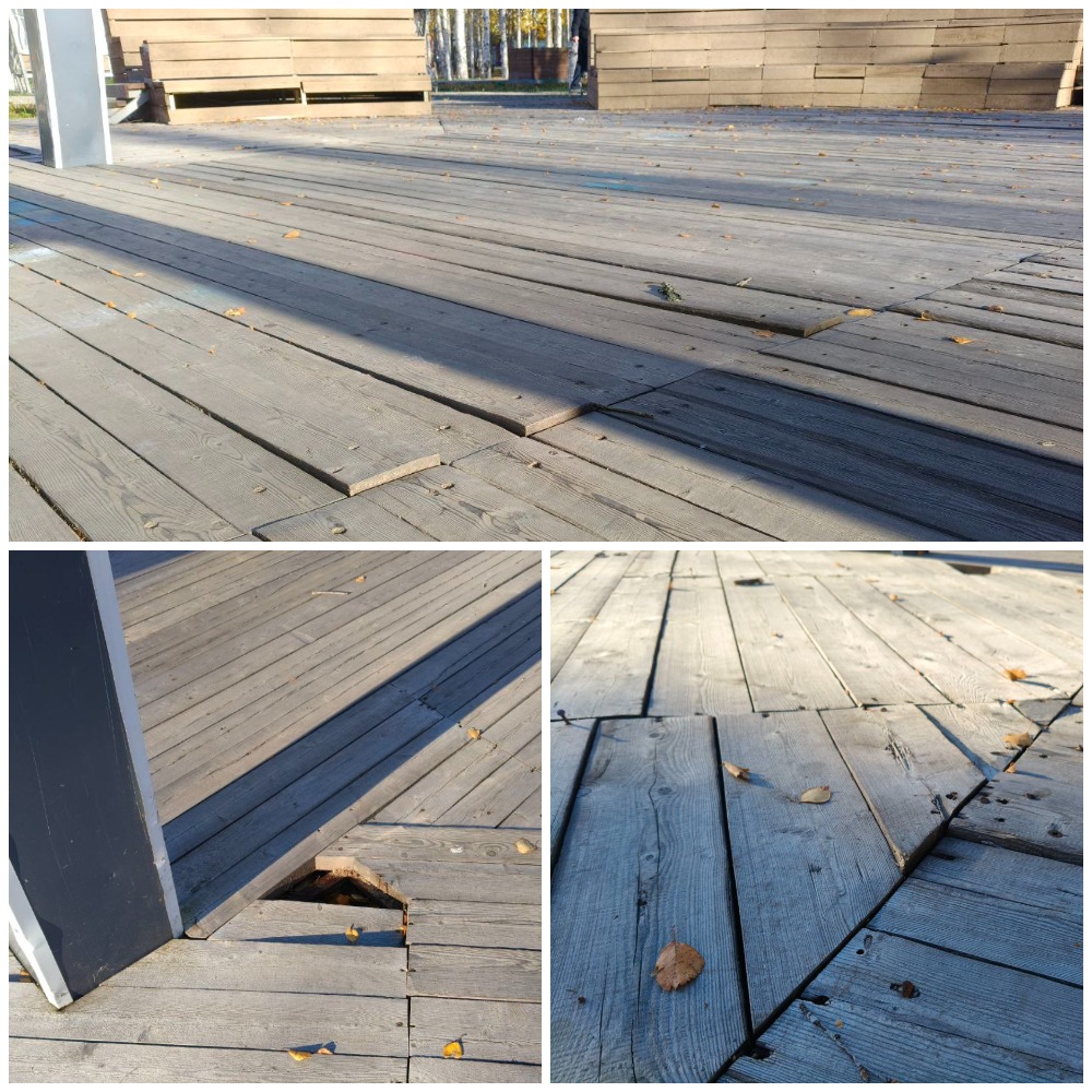 Покрытие сцены так же похвалить нельзя: доски во многих местах расшатались, выпирают одна над другой, в одном месте и вовсе отсутствуют. На такой сцене и в трезвом уме можно запнуться, остаётся только воображать, что чувствуют дети, которых заставляли танцевать там в мягких чешках.