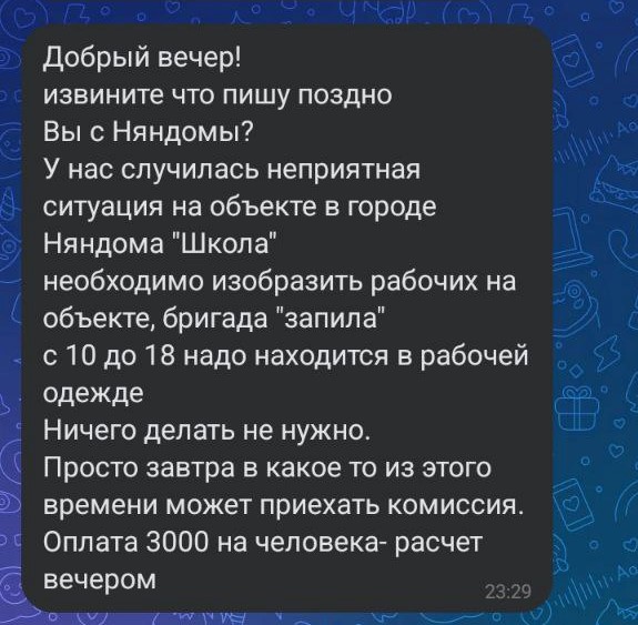 К слову про специалистов. Начала разгораться история со школой после опубликованного в соцсетях объявления о наборе массовки перед приездом комиссии. Подтвердить или опровергнуть это на данный момент не представляется возможным (если только правоохранительным органам), однако в последующие после этого дни в столицу Поморья поездом из Няндомы отправилось порядка тридцати архангельских студентов, задействованных на стройке. Дружной компанией зашли в близлежащий магазин, купили еду перед поездом, кто-то там же в магазине и покушал. Находились они в городе порядка недели и, как сообщают местные жители, в разговоре с ними уставшие парни рассказали, что получили за это время порядка 15 тысяч рублей на каждого.
