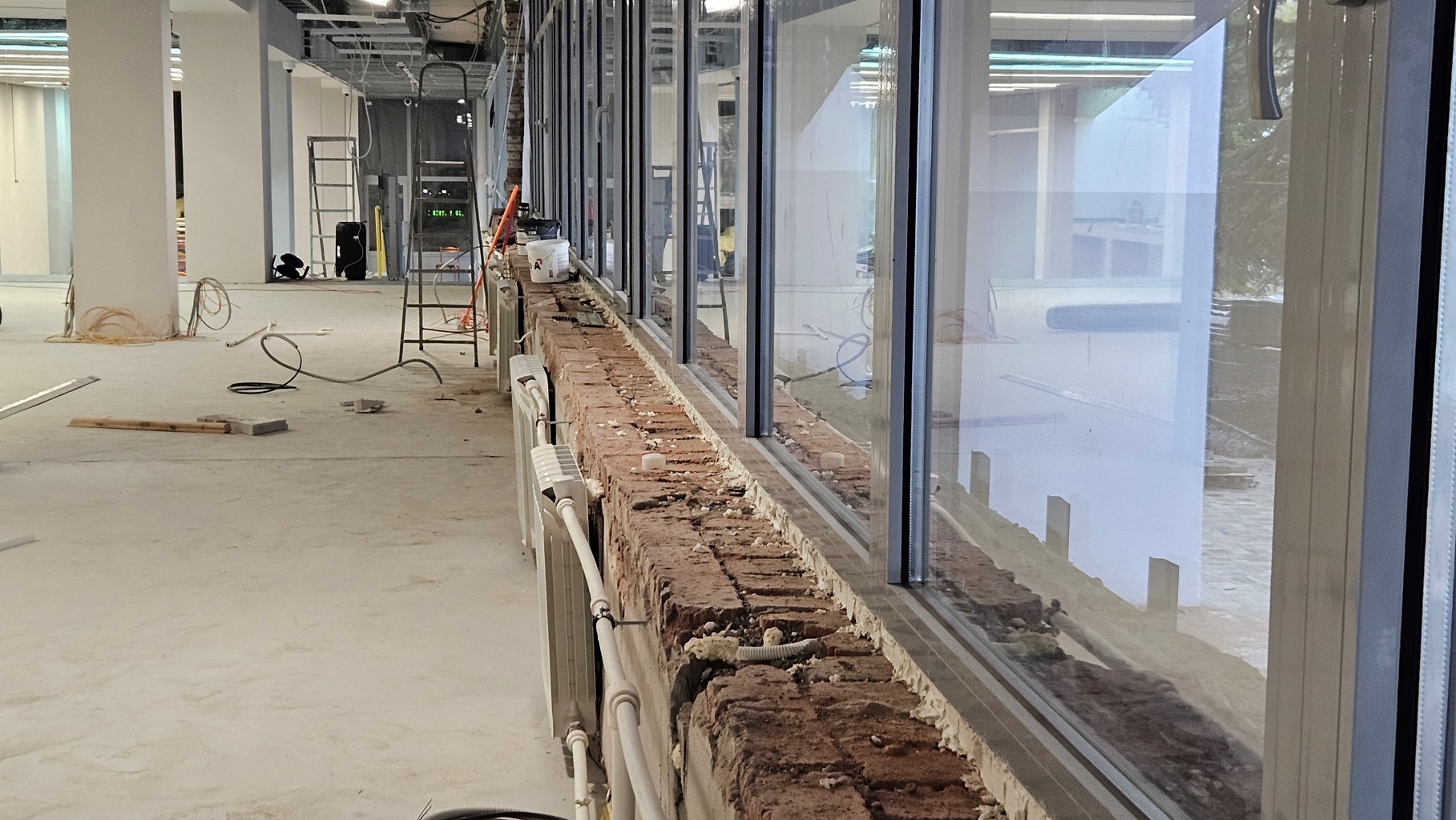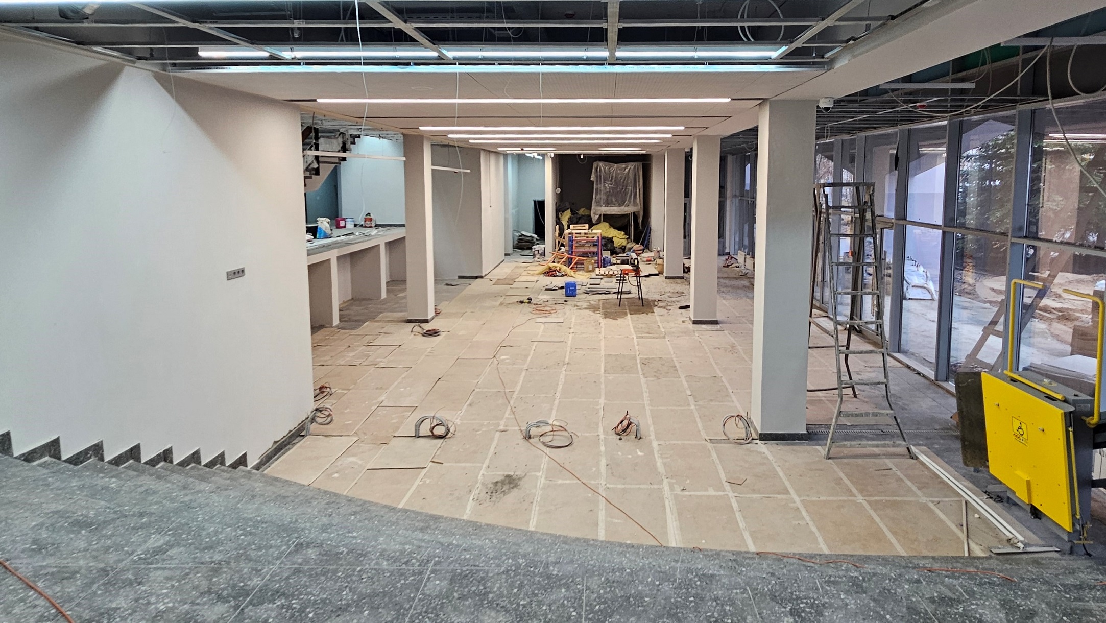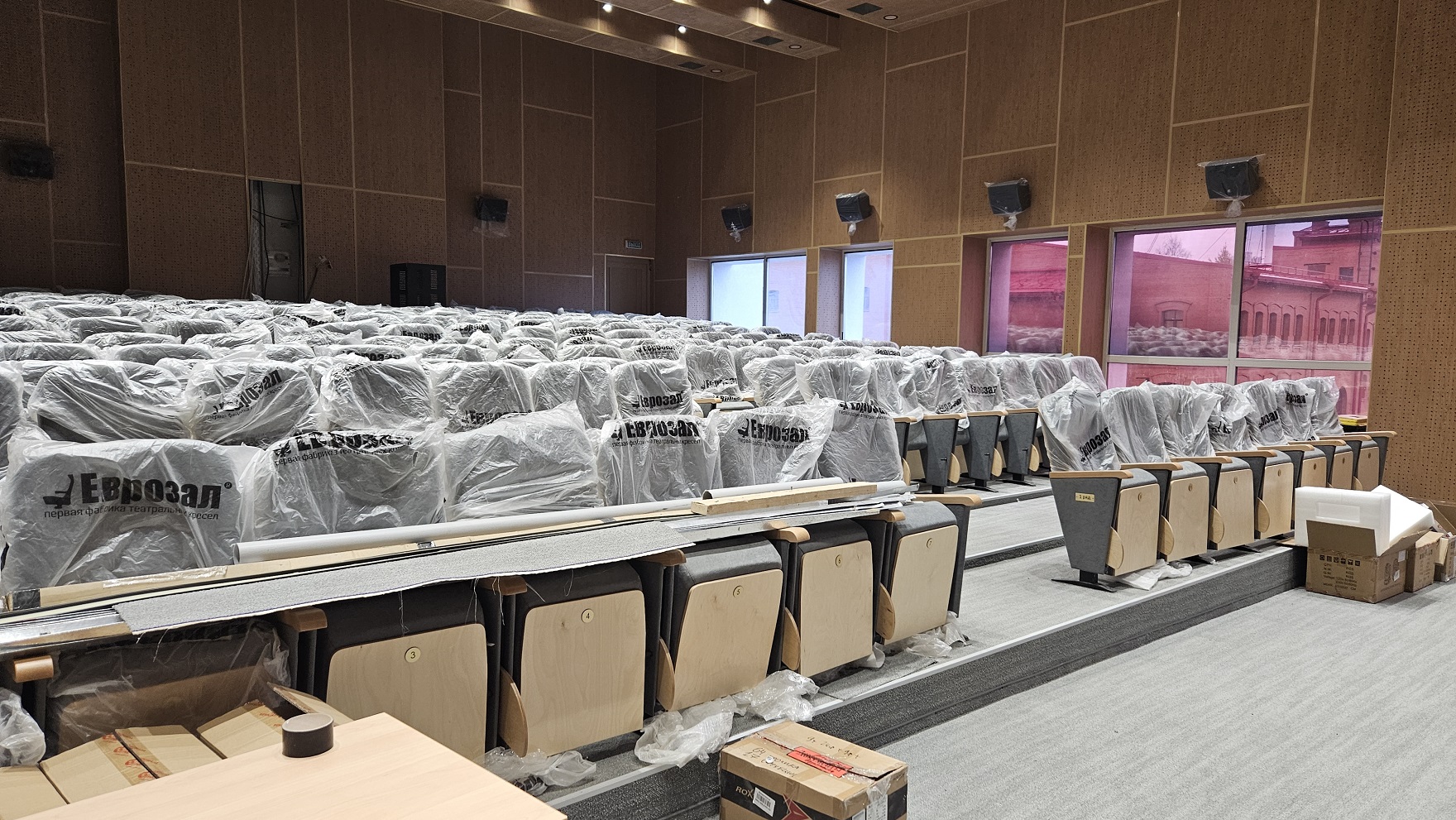 Сейчас же из наполнения (в местах, где «грязных» работ уже не предвидится) есть полки, кресла в двух обновлённых залах и несколько телевизоров.