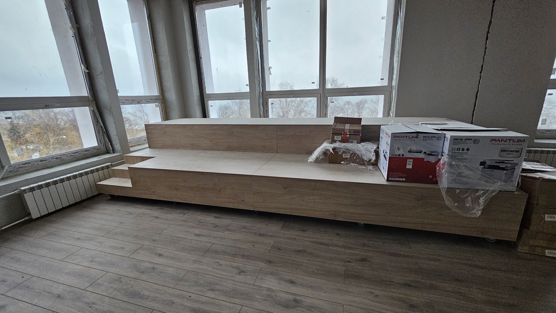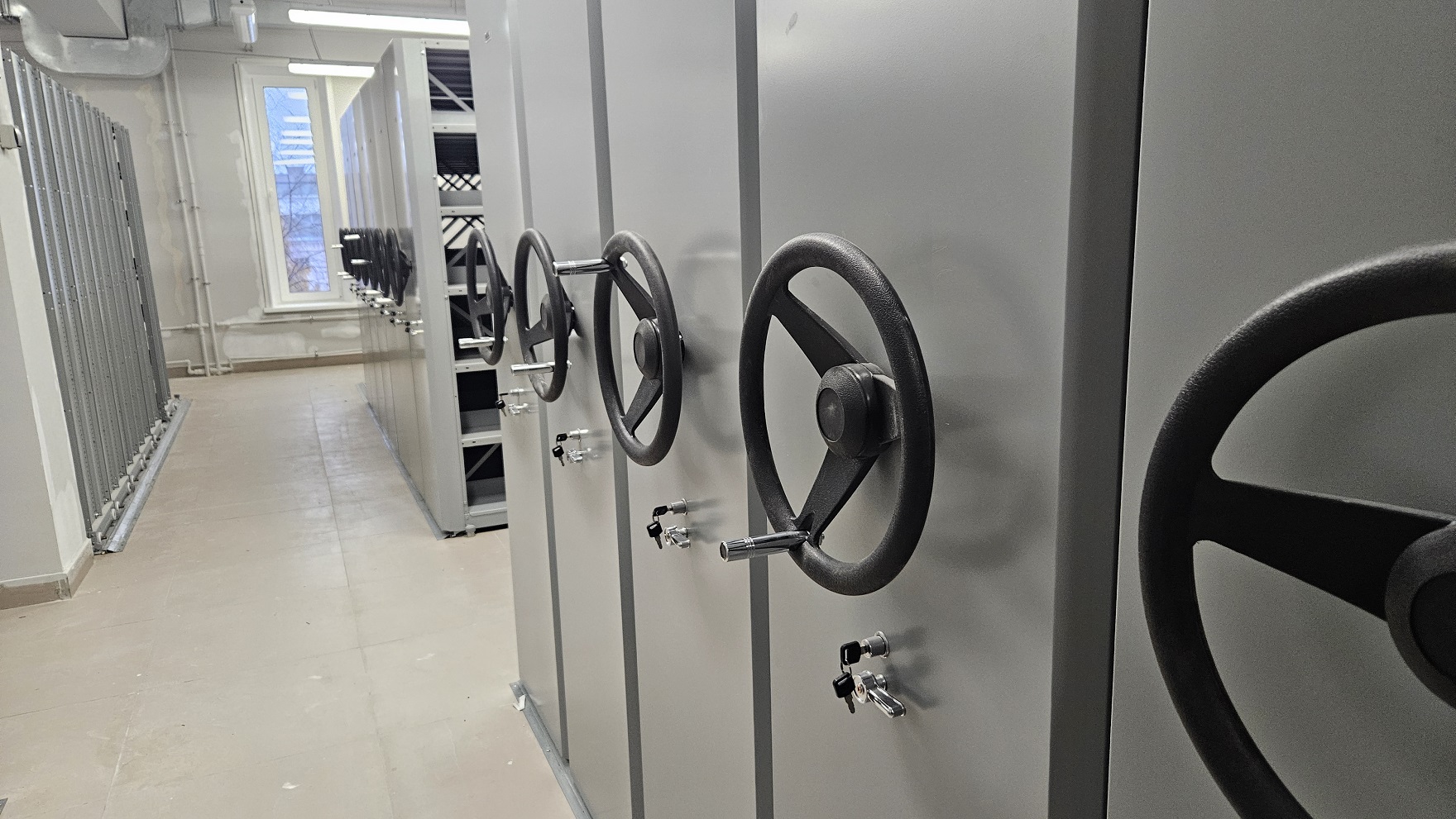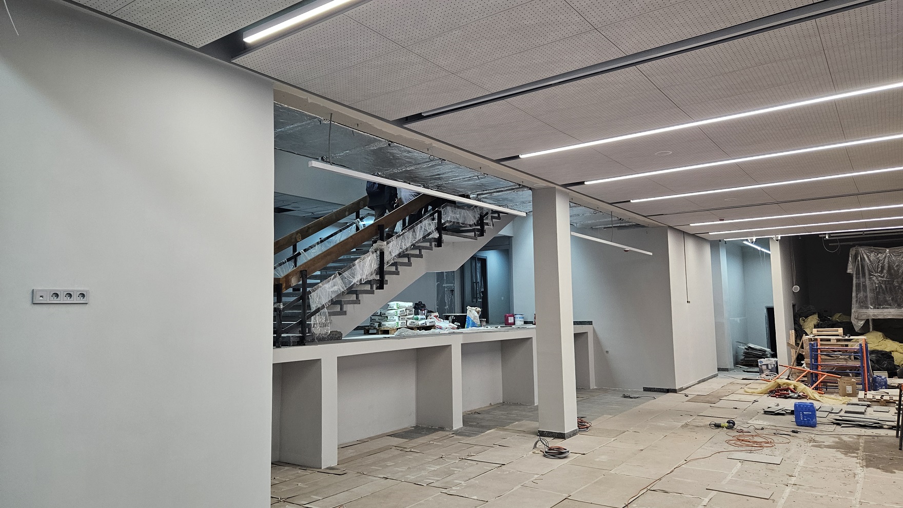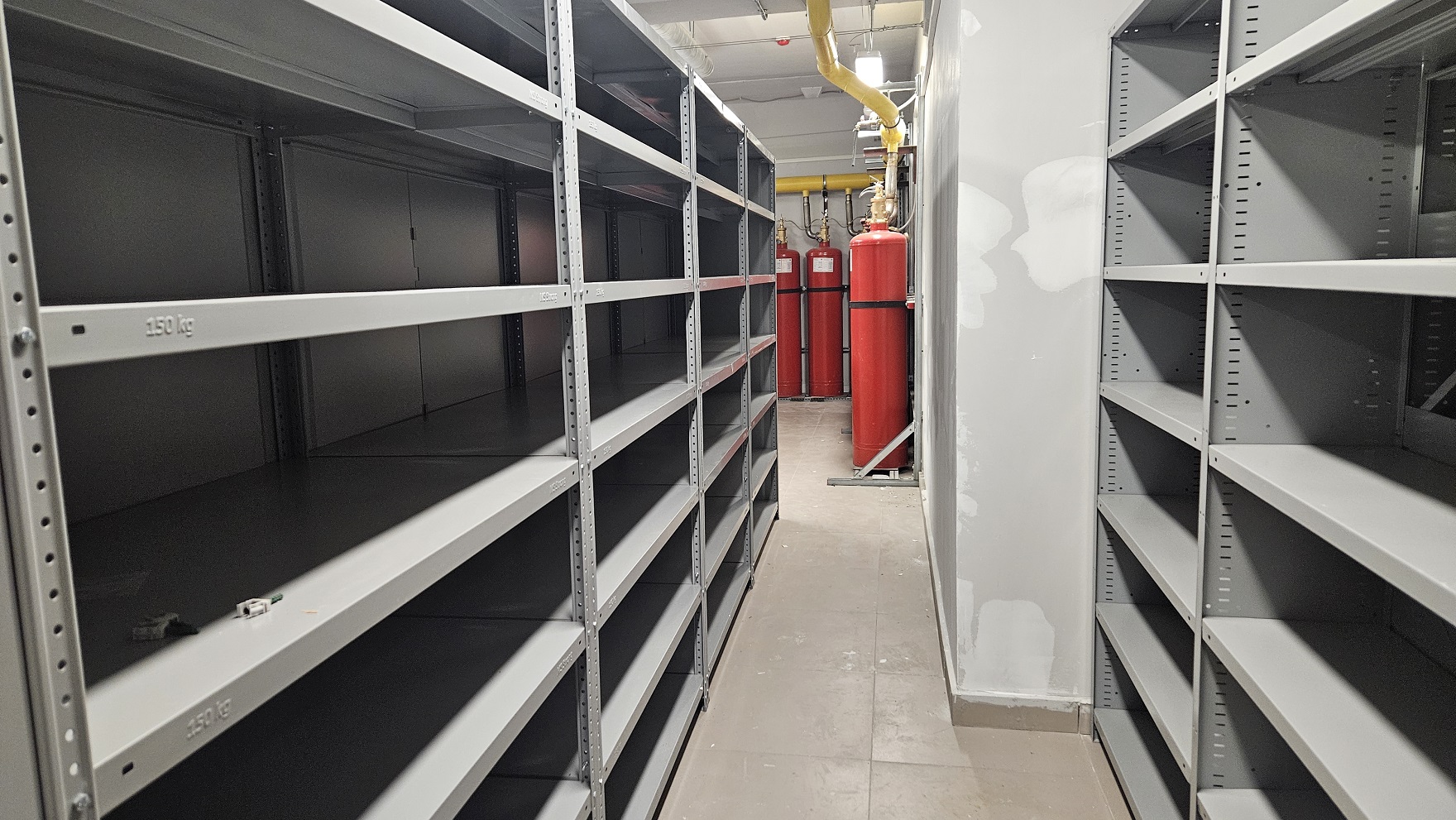 Сейчас же из наполнения (в местах, где «грязных» работ уже не предвидится) есть полки, кресла в двух обновлённых залах и несколько телевизоров.