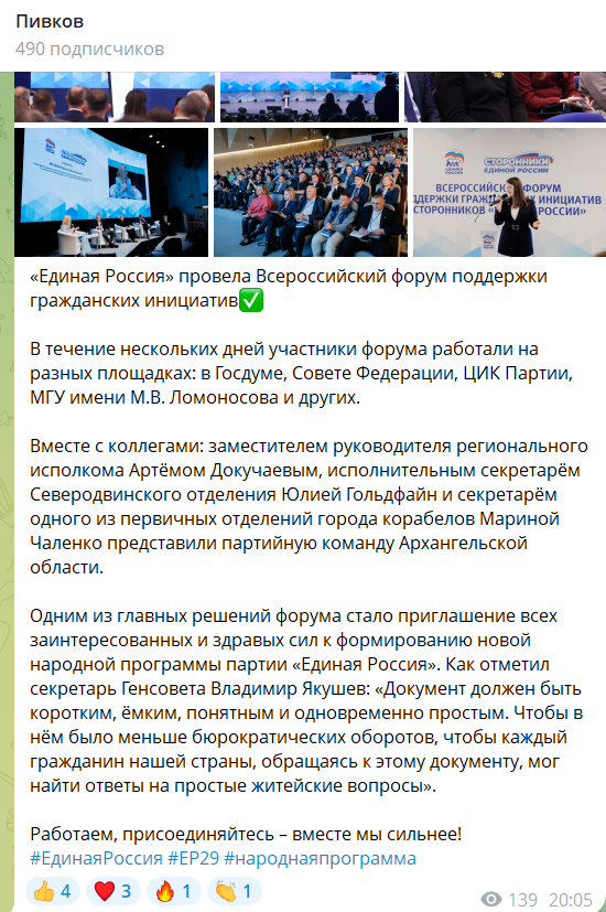 Отсутствие Пивкова объяснилось уже на следующий день — его ждала дорога в Верхнюю Тойму, где ему было «приятно» от вида обновлённой набережной и «тепло» от встречи с представителями местной ячейки «Единой России». Именно в партии Сергей видит опору в каждом регионе, от чего испытал необыкновенную радость, которая продлилась до самого вечера. К 20:00 опять пришло время осмыслять. Пивков внимательно прочитал о встрече Александра Цыбульского с полпредом Гуцаном и отчитался репостом. Снова без комментариев от автора канала.
