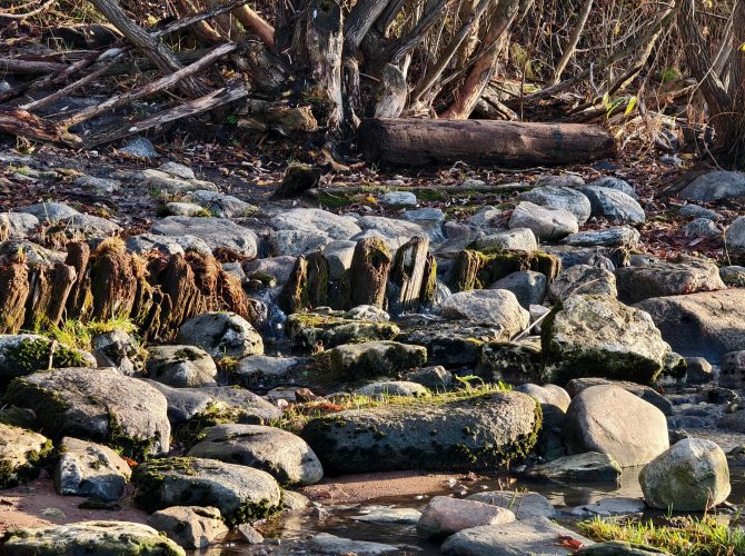 Недавно гулял вдоль набережной, около Октябрьского суда. Спустился вниз, подле мореходки есть красивое уютное местечко. Северная Двина, как и прочие водные объекты области, порядочно обмелела, и в месте аккурат между Федеральным исследовательским центром комплексного изучения Арктики им. академика Н. П. Лавёрова РАН и Набережной Северной Двины 110 к.1 в великую реку бодро бегут вонючие ручьи. Так как вода ушла, то всё теперь это и видно. Воняет — извините меня: аж глаза режет.
