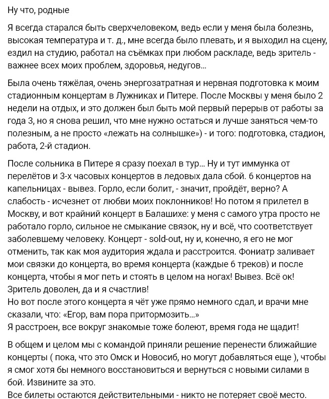 «Уважаемые зрители! Вынуждены сообщить, что по техническим причинам концерт Егора Крида в Архангельске 5 ноября не состоится. Деньги за купленные билеты будут возвращены», — говорится в сообщении концертного агентства «Небо Рекордс».
