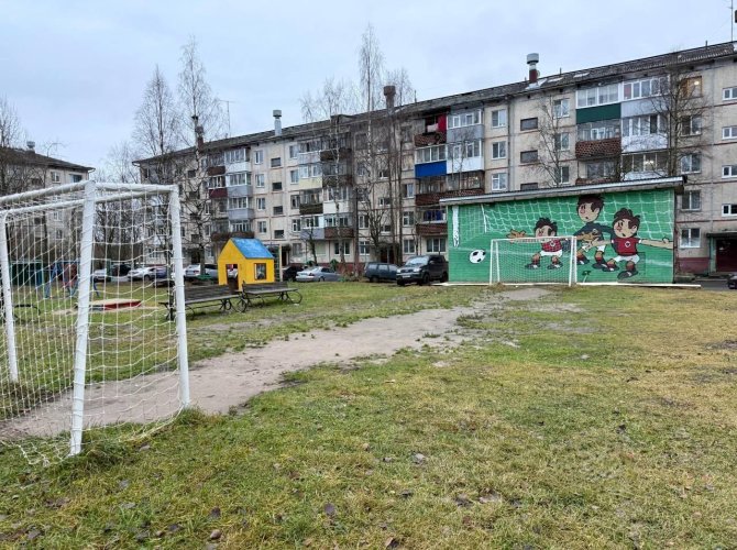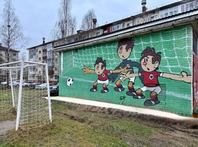 Благодаря проекту «Комфортное Поморье» оживился и двор дома № 3 по улице Солнечной. Яркое граффити по мотивам советского мультфильма про футбол украсило стены трансформаторной подстанции. Эта идея, инициированная жителями данного двора, гармонично вписалась в уличное пространство спортивной площадки.