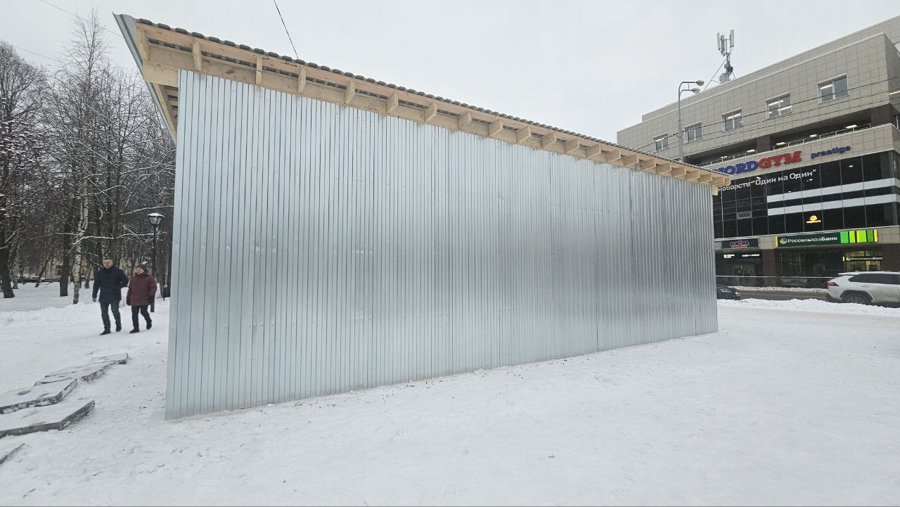 Сначала «Марк» заботливо укрыли какой-то тканью, затем соорудили каркас из досок, зачем-то налепили баннер с фотографией танка и информацией о нём, а затем обшили оцинкованным профнастилом.