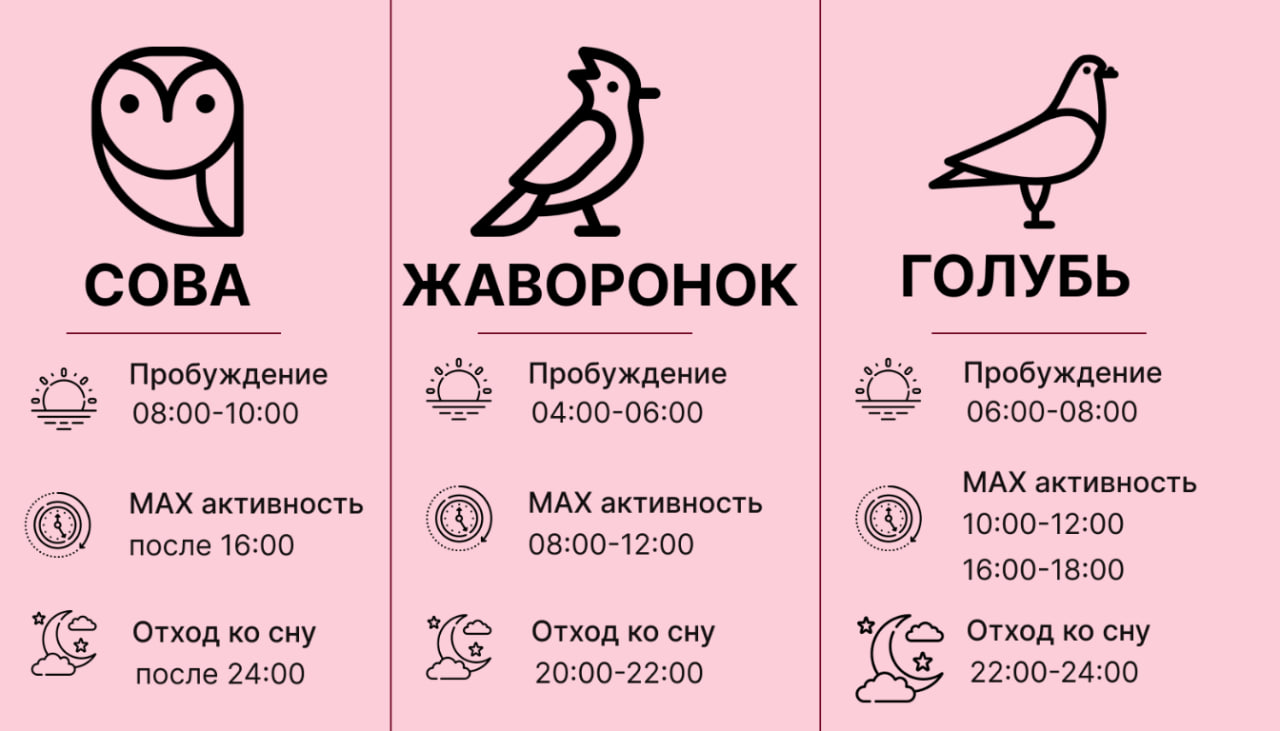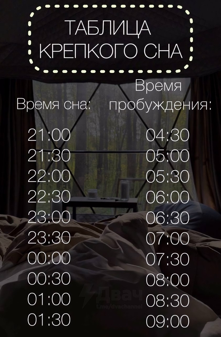 Ведь все люди разные, и кому-то хватает буквально 3 часа, чтобы выспаться и набраться сил (как, например, президенту России Владимиру Путину), кто-то спит дробно, как Криштиану Роналду (4,5 часа ночью и полтора часа днём; да ещё и каждый раз на свежем постельном белье, о как!), а кто-то так и вообще не высыпается и за 10-12 часов.Пройдёмся по сути. Здесь и далее текст под авторством гуру сна и пробуждения, мастера спорта по сну в положении стоя и в ревущей могучим двигателем кабине МТ-ЛБ — многоцелевом транспортёре-тягаче лёгком бронированном («Объект 6», «мотолыга», гусеничный вездеход многоцелевого назначения) — Михаила Майстренко, а также его помощника, профессора сонных наук, индивидуального искусствоведа Анатолия Анатольича Барыгина-Амурского.Все приведённая выше таблица, по сути, сводится к тому, что, мол, время отхода ко сну и пробуждения напрямую определяет качество отдыха: якобы одни часы «ценнее» других (например, распространён миф: «час сна до полуночи равен двум после»).Однако наука говорит о структуре сна несколько иное…Сон состоит из циклов (в среднем 90 минут), включающих три фазы:NREM 1 (поверхностный сон, 5–10 мин);NREM 2 (неглубокий сон, 10–25 мин);NREM 3 (глубокий сон, до 40 мин в первом цикле);REM (быстрый сон, от 10 мин в первом цикле до 90 мин в последнем).Ключевой факт: глубокий сон преобладает в первой половине ночи, REM‑сон — во второй. Поэтому время засыпания влияет на распределение фаз.Почему «универсальная таблица» проблематична? Потому что, во-первых, налицо имеются индивидуальные различия. Хронотип («жаворонок», «сова», «голубь») задаёт оптимальное время сна. Для «совы» засыпать в 22:00 может быть так же вредно, как для «жаворонка» — в 01:00.Возрастные нормы. Детям нужно больше сна, пожилым — меньше; фазы тоже меняются с возрастом.Внешние факторы. Свет, стресс, кофеин, гаджеты сдвигают внутренние часы (циркадные ритмы).Длительность vs время. Для здоровья критична общая продолжительность (взрослым — 7–9 часов), а не только «магические часы».Но вот что действительно важно для качественного сна, так это его регулярность: ложиться и вставать нужно в одно время даже в выходные. Ну, плюс-минус. Не надо отсыпаться в прибавлении с плюсом 4-5 часов за одну субботу, например.Важные также темнота и тишина, потому что мелатонин (гормон сна: именно он помогает засыпать и просыпаться, регулирует глубину и качество сна) вырабатывается только в темноте.Перед сном можно принять тёплый душ, посвятить полчаса чтению, релаксации.Комфорт очень важен. Удобный матрас, температура в комнате 18–20 °C.Отсутствие стимуляторов: кофеин, алкоголь, тяжёлая еда исключаются за 3–4 часа до сна. Хотя, опять же, некоторые пьют на ночь кофе и спят даже лучше, чем без него.Почему мифы о «ценности часов» устойчивы? Тут две стороны одного обоюдоострого меча. Если человек ложится в 23:00 и встаёт в 7:00, он получает больше глубокого сна, чем при сне с 01:00 до 09:00. Но это не значит, что «час до полуночи вдвое ценнее» — просто сдвиг нарушает естественные циклы.Людям — особенно в современном бешеном ритме жизни — удобно верить в «волшебное время», чем вникать в сложные биоритмы. Увы, как говорится, и ах.Стоит также отметить, что людям, работающим 2×2 или сутки через трое, все эти волшебные времена и таблицы, в основном, побоку. Хотя автор текста лично знает людей, работающих как раз 1×3, которые не спят с