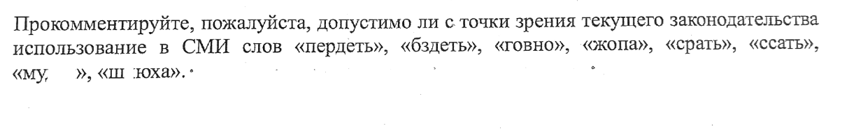 — Использование бранных (не нецензурных) слов в материалах средств массовой информации ограничено. Так, Федеральным законом от 29 декабря 2010 г. № 436-ФЗ «О защите детей от информации, причиняющей вред их здоровью и развитию» предусмотрено ограничение на распространение бранных слов среди детей определенных возрастных категорий, — поясняют в РКН.