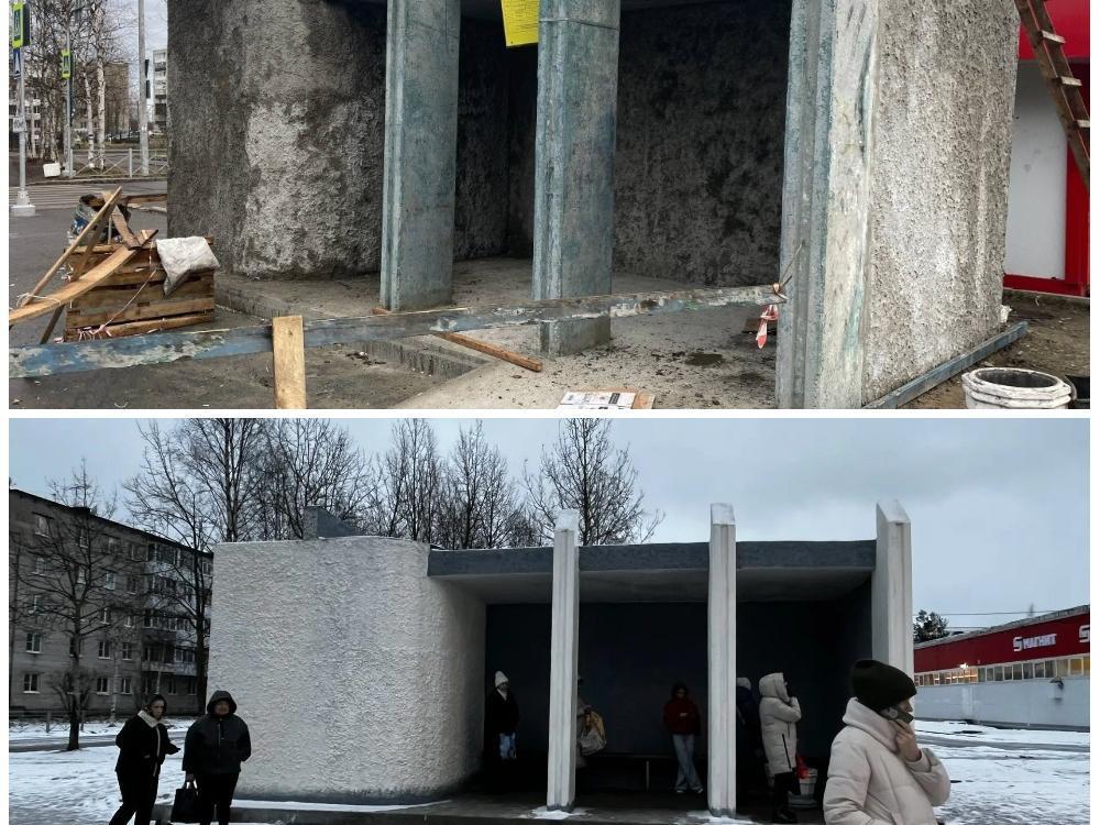 В пресс-службе горадмина сообщили, что в павильоне обновили штукатурку на стенах, укрепили швы и плиты, перекрыли кровлю, сделали удобный пандус, установили скамейку и урны. Кроме того, остановку покрасили в те же цвета, в которых оформлена стела «Микрорайон первых пятилеток».