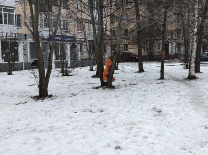 Сейчас некогда любимая большая игрушка чьих-то детей мокнет под декабрьским дождём с грустным выражением на лице. Лапы почернели.