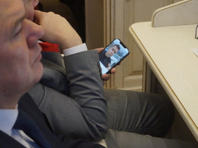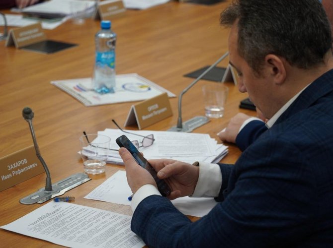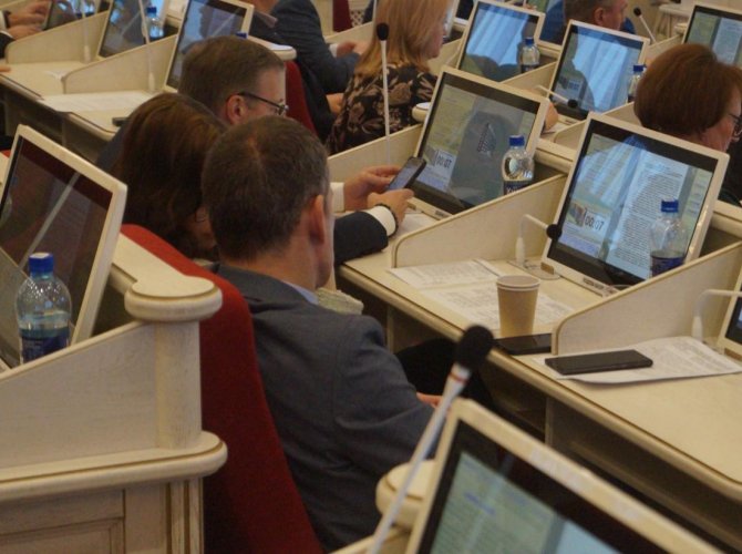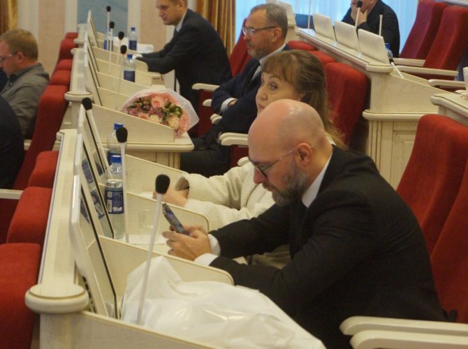 В Архангельской городской Думе депутаты тоже периодически отвлекаются на гаджеты. Однако в зале заседаний АГД это выглядит в разы палевней, чем в АОСД. Всё же стол один и законотворцы друг напротив друг сидят.