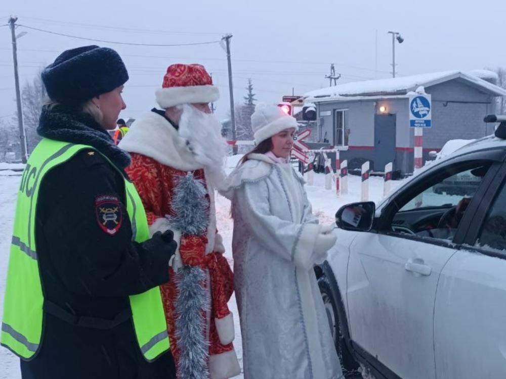 Сегодня в Архангельске на железнодорожном переезде станции Жаровиха «Новогодний рейд» для привлечения внимания общественности к безопасности на переездах. В рейде вместе с сотрудниками Северной железной дороги и представителями Госавтоинспеции приняли участие Дед Мороз и Снегурочка.