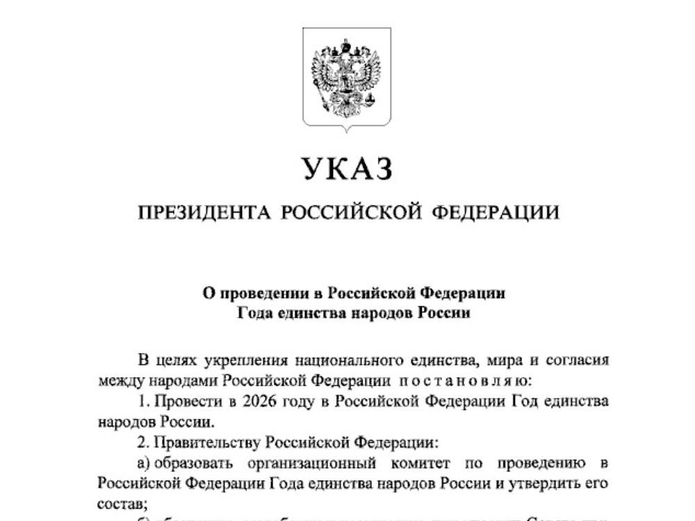 Опубликован указ Путина о проведении Года единства народов России25.12.2025 15:31 Президент РФ Владимир Путин сегодня сообщил, что подписал указ о проведении в наступающем 2026 году Года единства народов России. Соответствующий указ подписан. Напомним, что в Архангельской области 2026 год объявлен Годом культуры. Нашли ошибку? Выделите текст, нажмите ctrl+enter и отправьте ее нам. | ||||