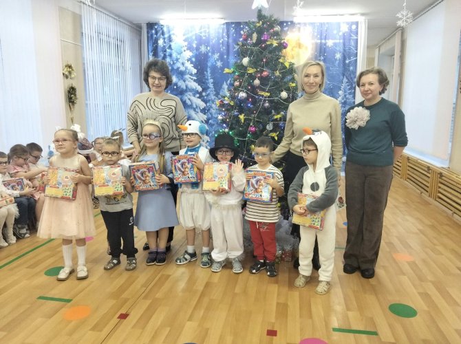 Кроме того, воспитанники детсада получили сладкие подарки. Детям из трех специализированных групп сюрпризы вручили у новогодней елочки.