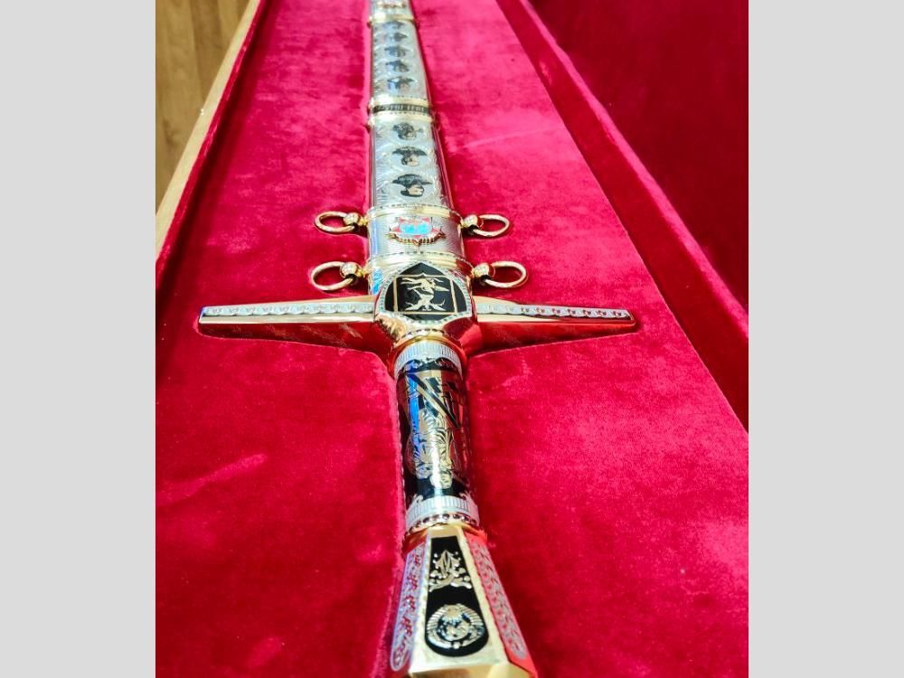 Меч, изготовленный златоустовскими мастерами, украшен гравировкой «Архангельск», а также гербом города. Инкрустирован полудрагоценными уральскими камнями и голубыми топазами.