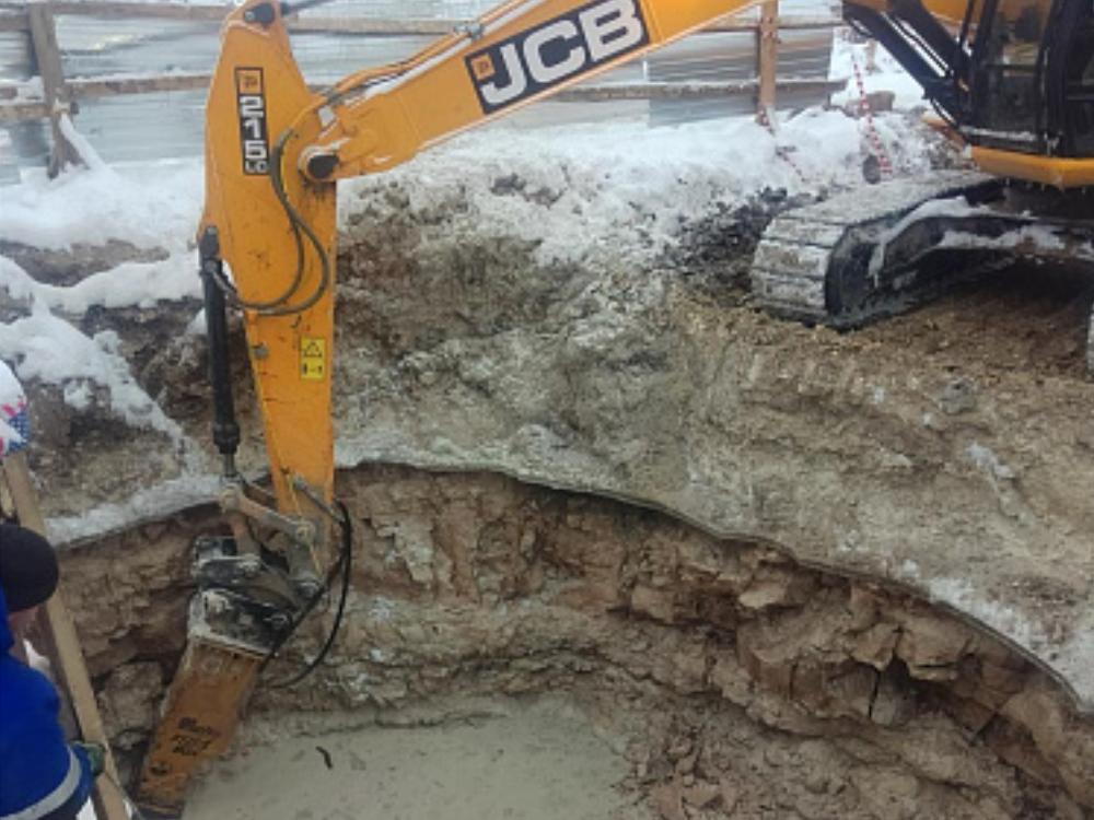 Теперь подрядчик ведет работы на другой стороне реки. Установлено шесть колодцев, на улице Чеснокова ведутся разработка котлована под канализационно-насосную станцию и устройство траншей для укладки трубопровода.