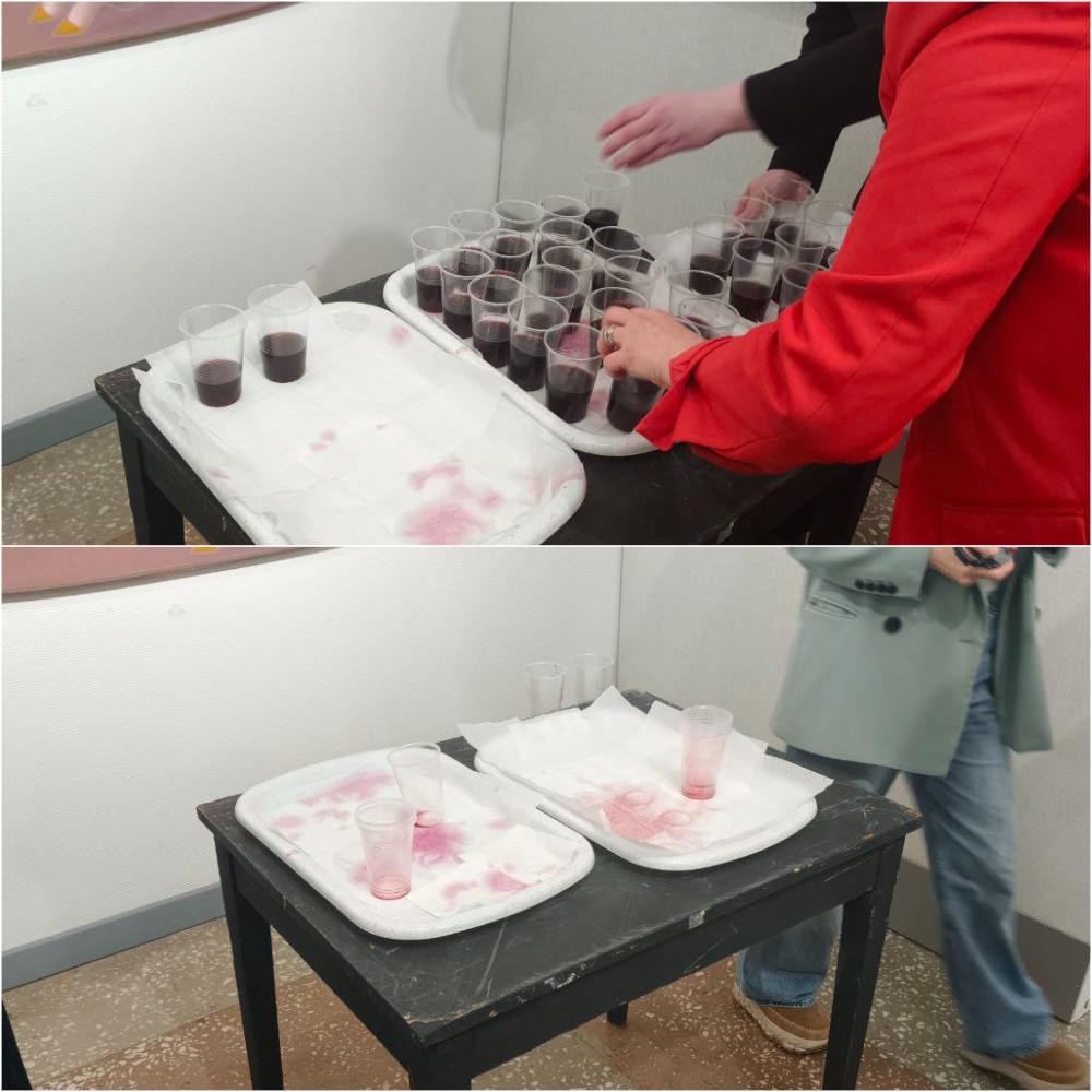 Пожалуй, больший ажиотаж, чем самые смелые работы на выставке, вызвали подносы с винишком. Вот уж где зевать точно не стоило — разлетелись вмиг. Пластиковые стаканчики опустели быстрее, чем автор успел сделать круг по залу.