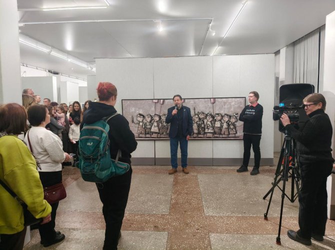 — Я рад всех видеть здесь, рад, что нас здесь так много собралось. Очень радостно было видеть количество работ, присланных нам для участия выставки, мы их отбирали до поздней ночи. Неожиданно много художников пришло, скажем так, с улицы. Если бы они все были здесь, то мы с вами не поместились бы в этом зале. Много было вопросов о том, по какому принципу мы отбирали картины. На самом деле, единственный принцип — мало-мальски профессиональный уровень работ.