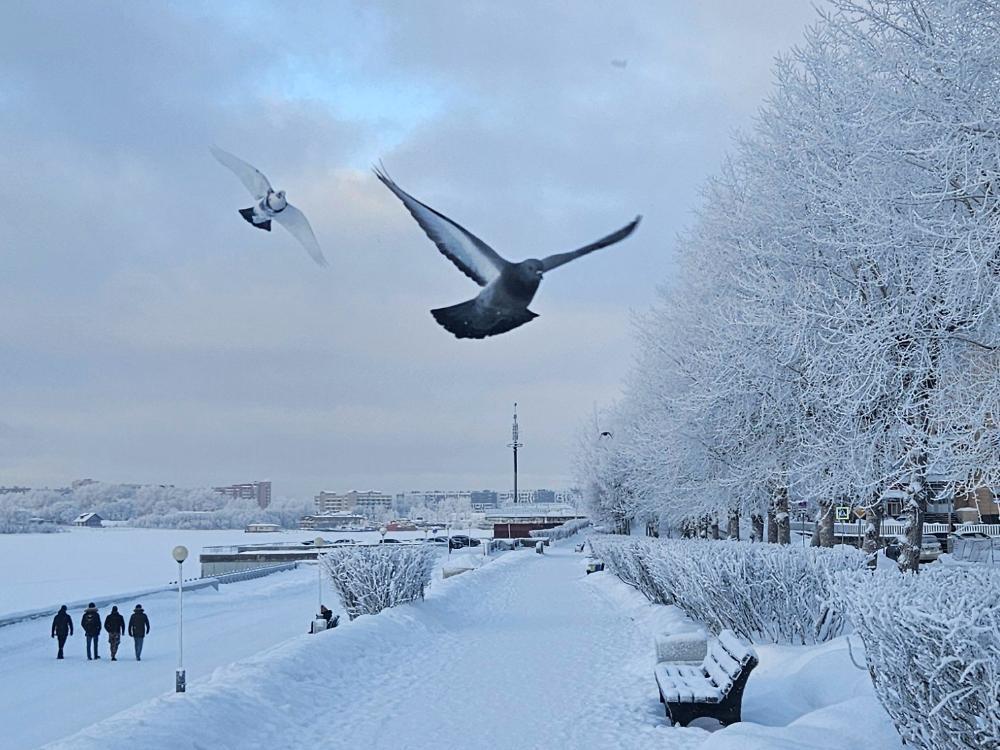 В понедельник днём -14°, пасмурно, снег. Ветер северо-восточный, восточный 3-4 м/с с порывами до 9 м/с. Ночью -13°.
