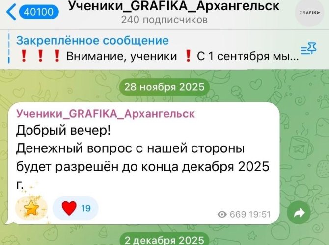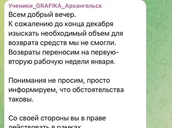Есть и другой важный момент — первое время ученикам и родителям действительно отвечали. Люди чувствовали, что закрытие школы для организаторов — боль, поэтому верили им, ждали, пытались разговаривать. Со временем общение прекратилось. В настоящий момент архангелогородцы боятся потерять деньги — суммы у всех разные, от 20 до 180 тысяч рублей, это лишь то, что нам известно. Поэтому они направили заявления в правоохранительные органы и обратились в СМИ.