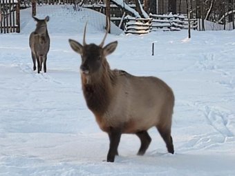 Марал ещё молодой, и рога еще маленькие, не ветвистые. Кстати, не знаем про рёв во время гона, но в жизни он потешно цокает и подсвистывает.