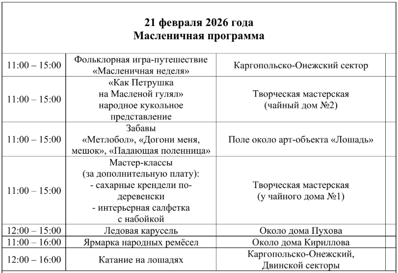 Ледяной столб для взрослых, как и в прошлые годы, ждёт самых смелых и ловких около дома Попова. У дома Кириллова гостей повеселит кукольный балаганчик с участием Петрушки, здесь же развернётся ярмарка народных ремёсел.