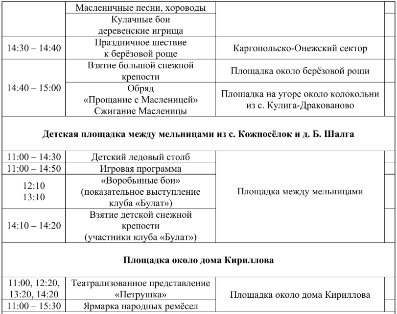 С 11 часов посетители смогут стать участниками фольклорной игры-путешествия «Масленичная неделя», встречи Масленицы и праздничного шествия масленичного поезда. После чего на центральной площади начнётся выпекание большого масленичного блина. Фольклорно-этнографический театр «Новиця» покажет старинные масленичные обряды: «Приезд зятя к тёще на блины», «Обновление молодых», «Столбы ставить». Традиционно состоятся деревенские игрища и кулачные бои.