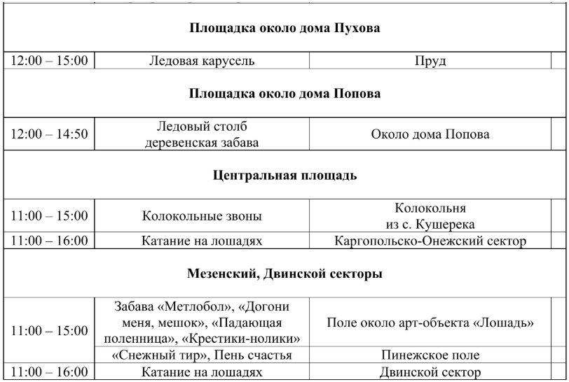 В Мезенском и Пинежском секторах для гостей, предпочитающих активный отдых, подготовлены площадки для игры в «Метлобол» и «Снежкобол», аттракцион «Догони меня, мешок», снежный тир и пень счастья.