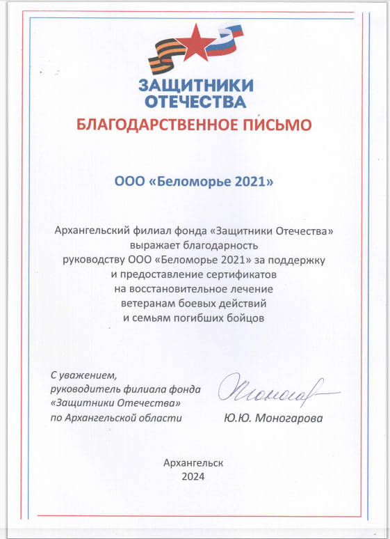 Помощь бойцам, вернувшимся со спецоперации, и их семьям продолжает оказываться на регулярной основе. Есть программы непосредственно для бойцов и непосредственно для их семей. Санаторий регулярно представляется для проведения круглых столов, встреч в ходе программы губернатора «Защитники. Под крылом Архангела».