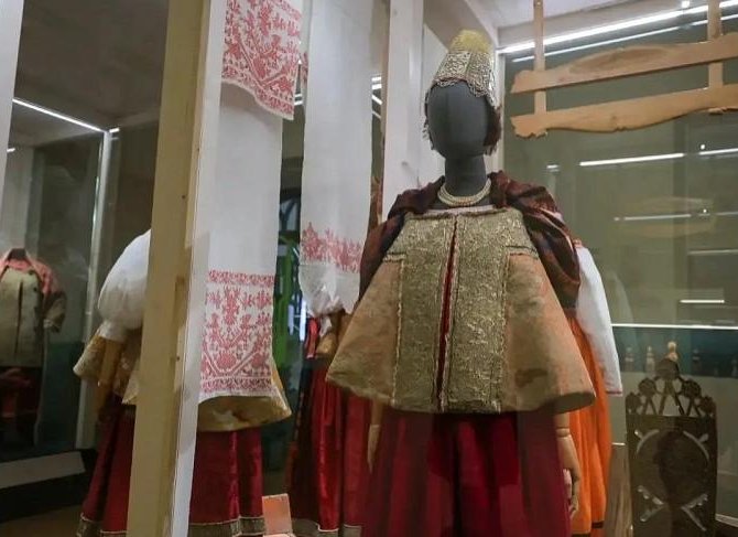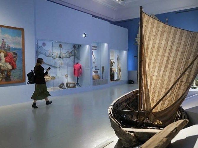 Одна из кураторских находок — разделение выставки на женскую и мужскую половины. К примеру, в одном зале рассказывается, что поморки подолгу оставались полновластными хозяйками дома, ведь мужья уходили в море на несколько месяцев. В двух витринах выставлены 28 аутентичных прялок из Першлахты, Вершинино, Ведягино, Зехновой, Тарасово и других деревень, стоящих по берегам Кенозера.