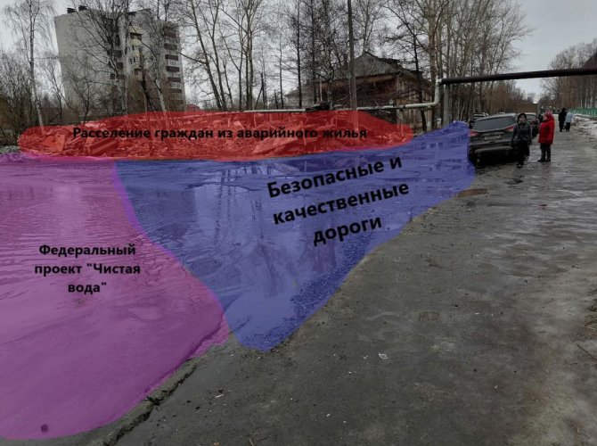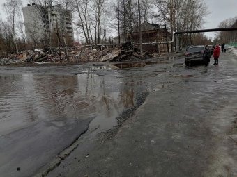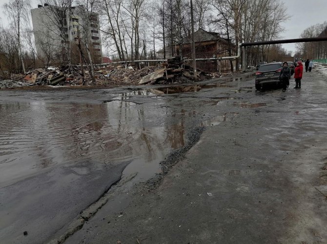 Чуть выше всем видно, что программа расселения людей из деревяг работает. Уже третью неделю тут разбирают аварийный дом. Уже третью неделю тротуар здесь отсутствует. Все, кто идёт от остановки к больнице, вынуждены по грязи выходить на проезжую часть, которая на 80% представляет из себя одну сплошную лужу. Шансы быть облитым проезжающей машиной приближаются к 100%.