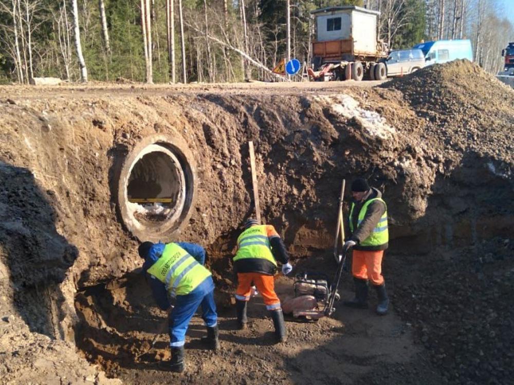 Подрядная организация выполнила устройство металлических труб, завершает расчистку полосы отвода и ведёт работы по устройству слоёв дорожной одежды на участках с пучинистыми грунтами.