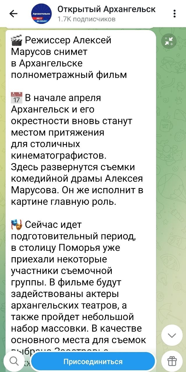 Изначально новость о съемках запостило сообщество «Открытый Архангельск», гордо заявив, что областная столица «вновь станет местом притяжения для столичных кинематографистов». Несмотря на не самый большой послужной список Алексея Марусова (достойно оценённая фестивальная короткометражка и причастность к сериалу на «ТНТ»), в горадмине подобрали такие слова, будто речь идёт о Михалкове или его брате, не меньше.