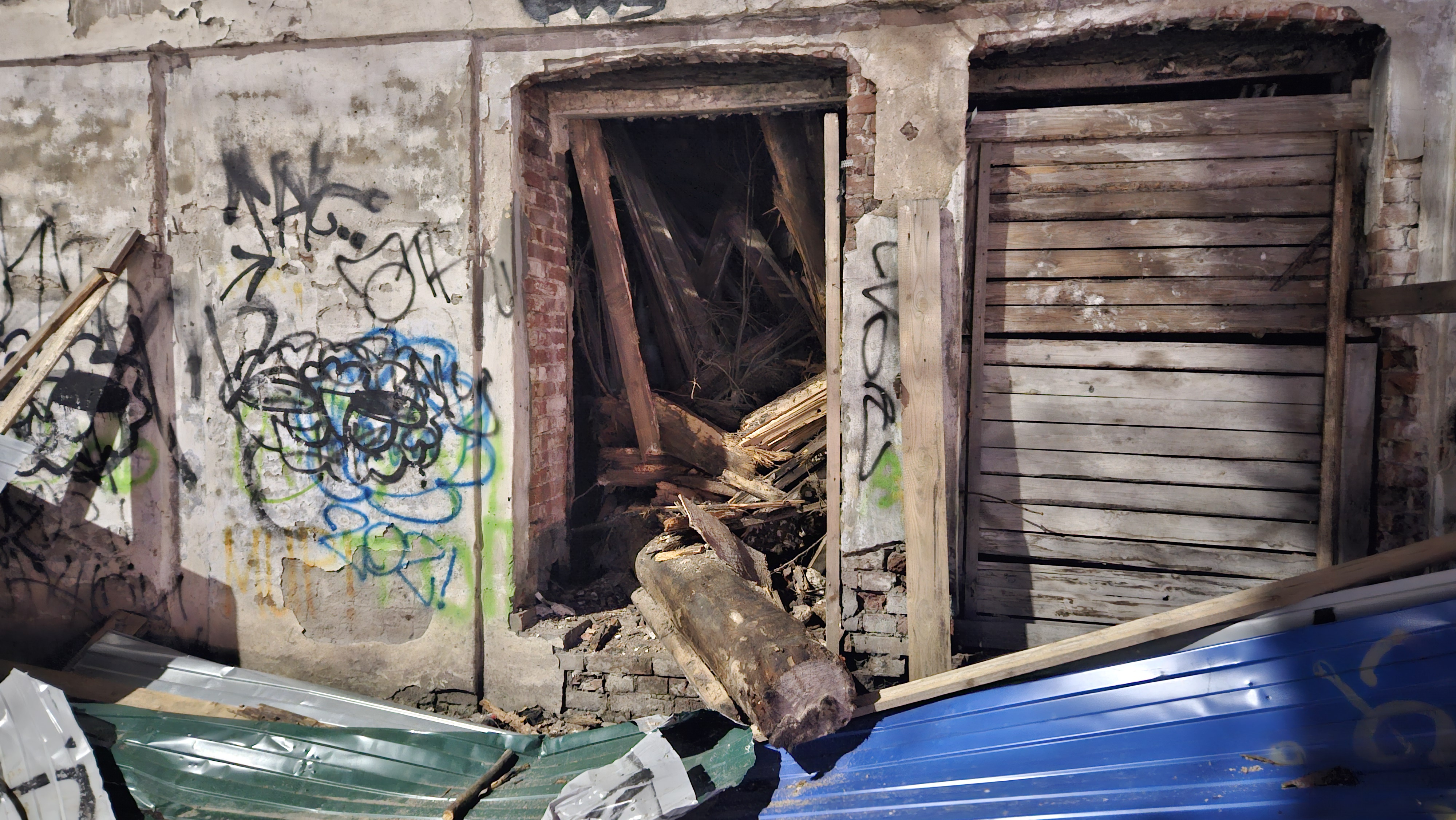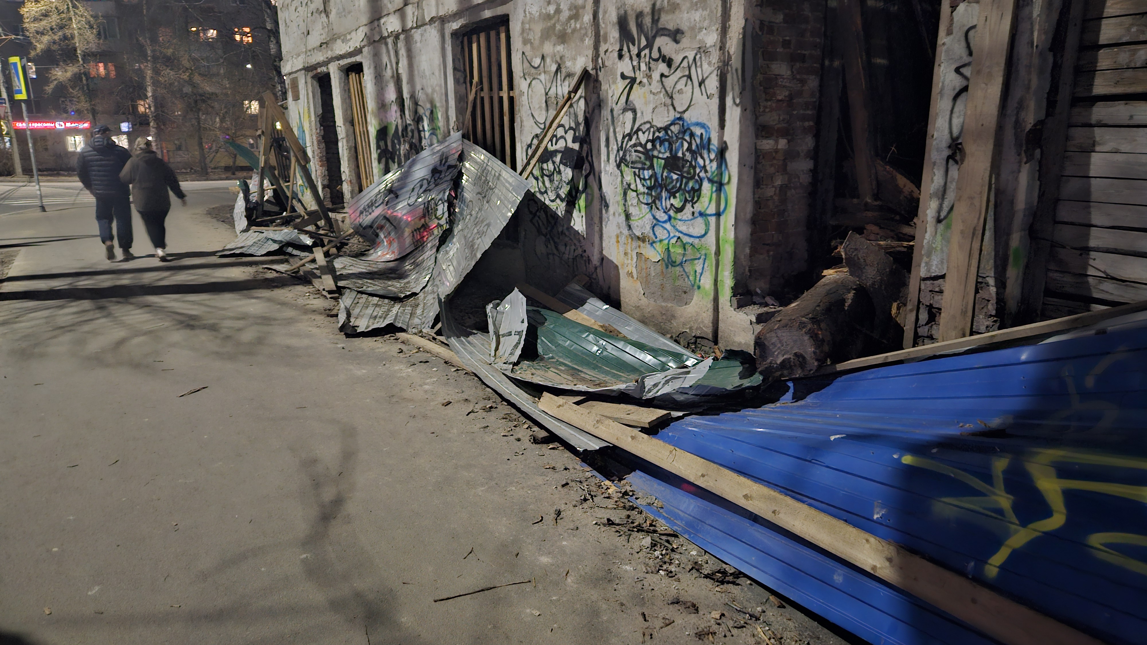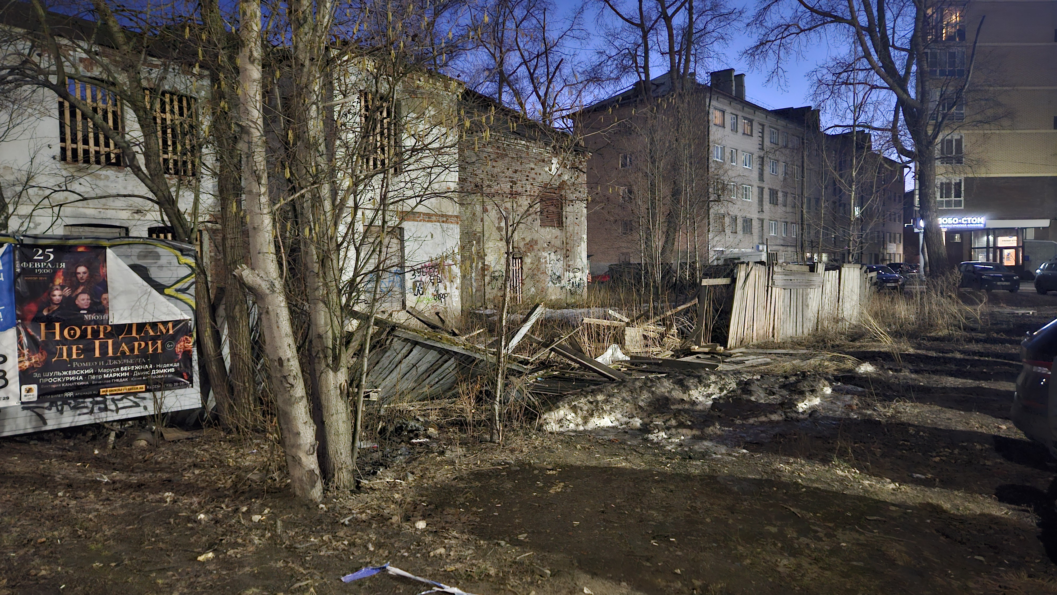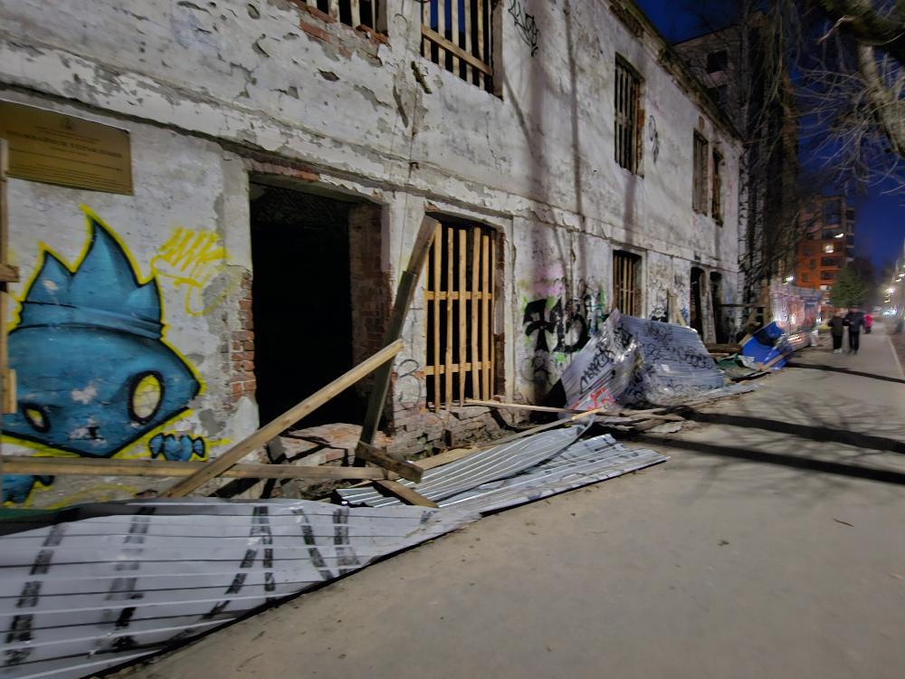 Забор буквально смят некоей могучей силой, внутри здание продолжается разрушение. Деревянное ограждение с другой стороны также расхристано.