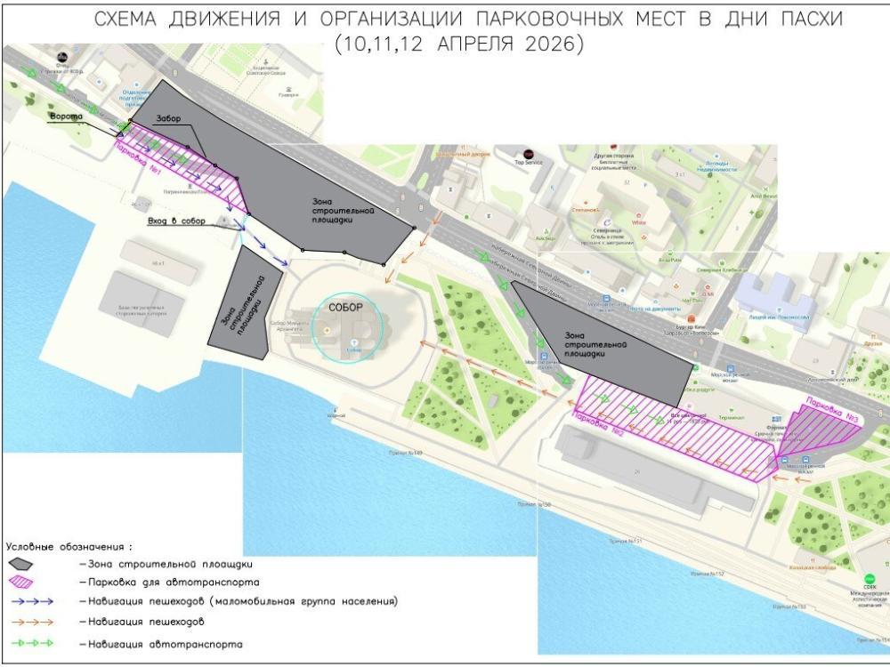 В пресс-службе администрации Архангельска пояснили, что в связи с большим количеством желающих посетить собор на площади Профсоюзов будут организованы дополнительные парковки. 10, 11 и 12 апреля оставить автомобиль можно будет в трёх местах: у здания пограничного управления, напротив МРВ, а также сбоку от ТЦ «Терминал». Доступ на территорию собора будет открыт с трёх сторон.