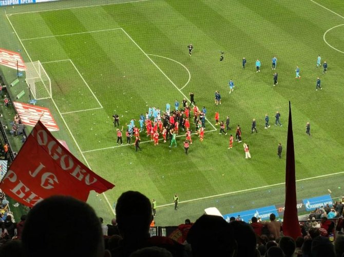 Это потом уже выяснилось, что во время объявления стартовых составов питерские сразу же орали оскорбления, а потом все увидели воочию, как в сторону спартачей-футболистов летят бутылки и иные предметы с фанатской трибуны домашней команды. И ещё началось «Ой, да это было до матча/после матча, мол, не считается».