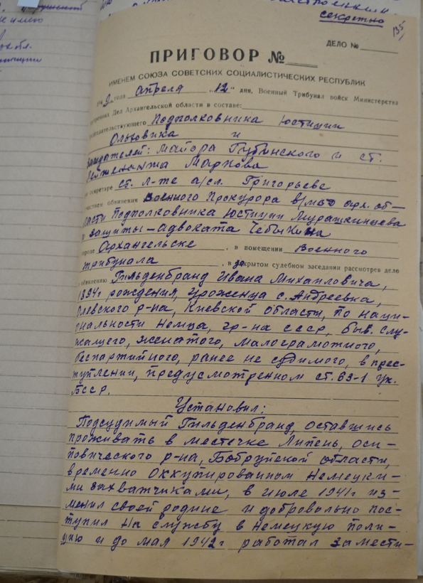 Почему не высшую меру? Сотрудники музея РУ ФСБ по Архангельской области и НАО говорят, что на момент 1949 года расстрелы отменили, а максимальное наказание за измену Родине составляло всего 10 лет, так что Гильденбранд получил выше верхнего предела.
