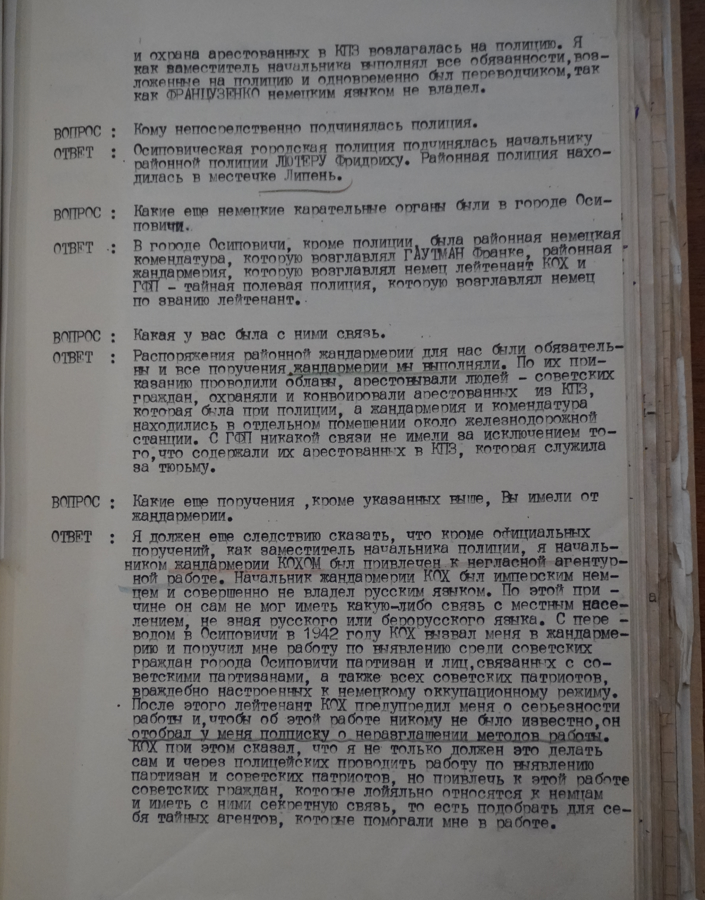Все это время на освобожденных территориях шли расследования военных преступлений захватчиков. Постепенно копился и банк показаний жителей Осиповичского района, которые все чаще называли одно и то же лицо, убивавшее их соотечественников.