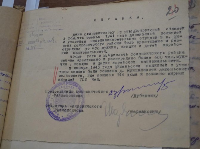 «Я лично видел осенью 1941 года, когда отступали советские войска, в местечке Липень около 50–60 человек советских граждан (евреев). Лично мой отец с группой в одиннадцать полицаев, сотрудники и жители в комиссариат около 50 человек и детей в комиссариат (евреев); лично мой отец с другими полицаевскими обливали бензином, полицаевские поджигали обливали бензином дом в скобяном магазине евреев. После поджога дома у окон и дверей стояли полицаи с пулемётами. Лично мой отец был вооружён также пулемётом. Нескольким евреям, несмотря на обстрел из пулемётов удалось вырваться из пылающего дома и убежать в лес, а большинство из них было сожжено заживо».